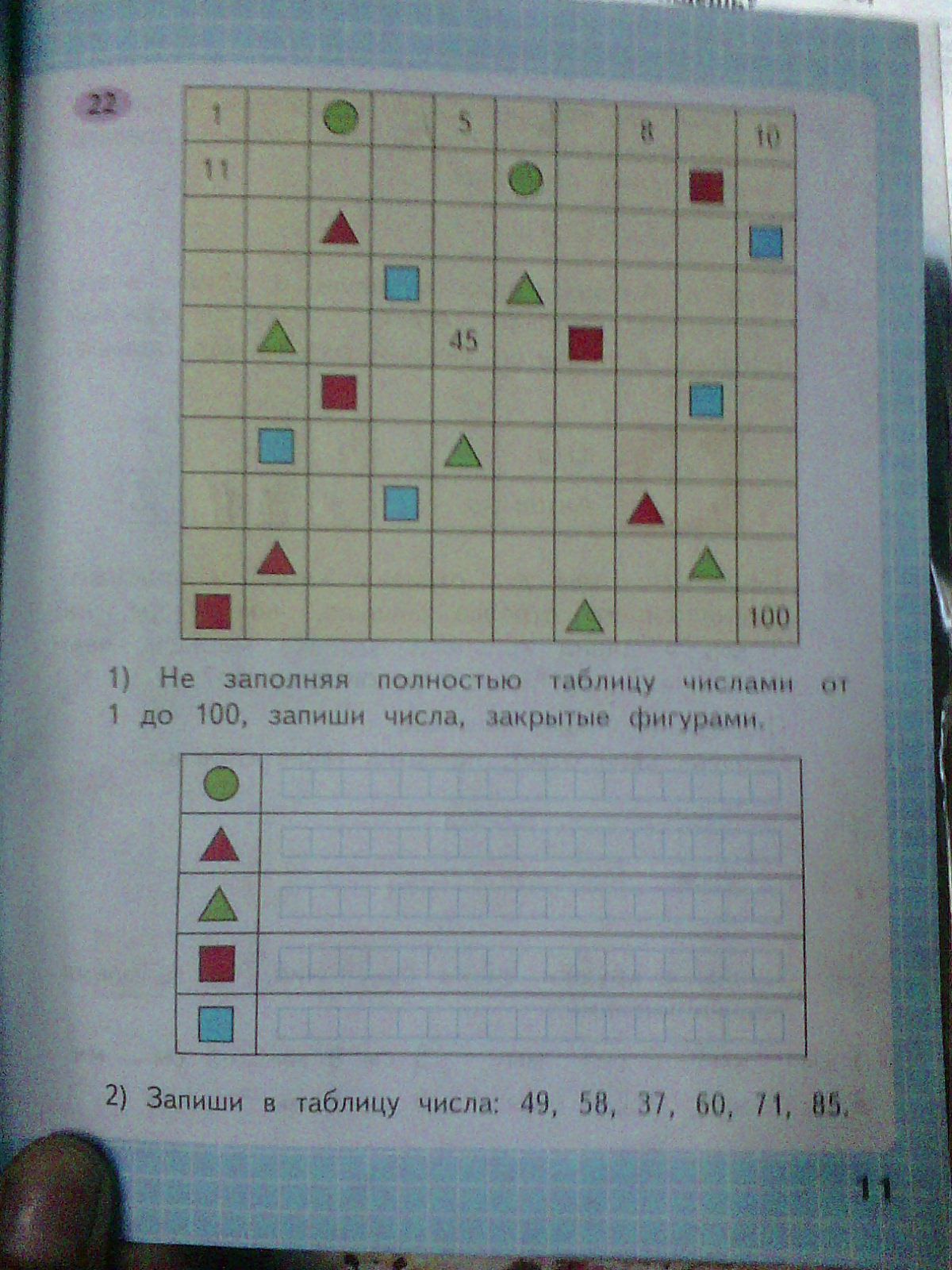 1) Не заполняя полностью таблицу числами от 1 до 100, запиши числа , закрытые фигурами.