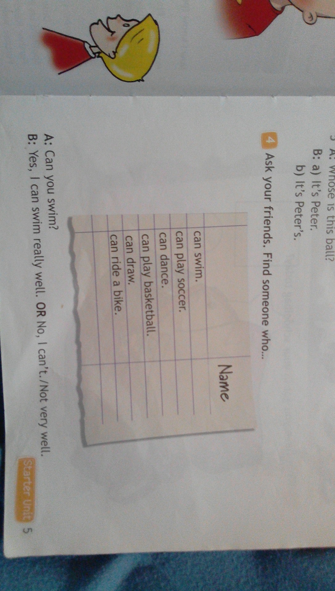плавать, играть в футбол, танцевать, играть в баскетбол, рисовать и ездить на велосипеде