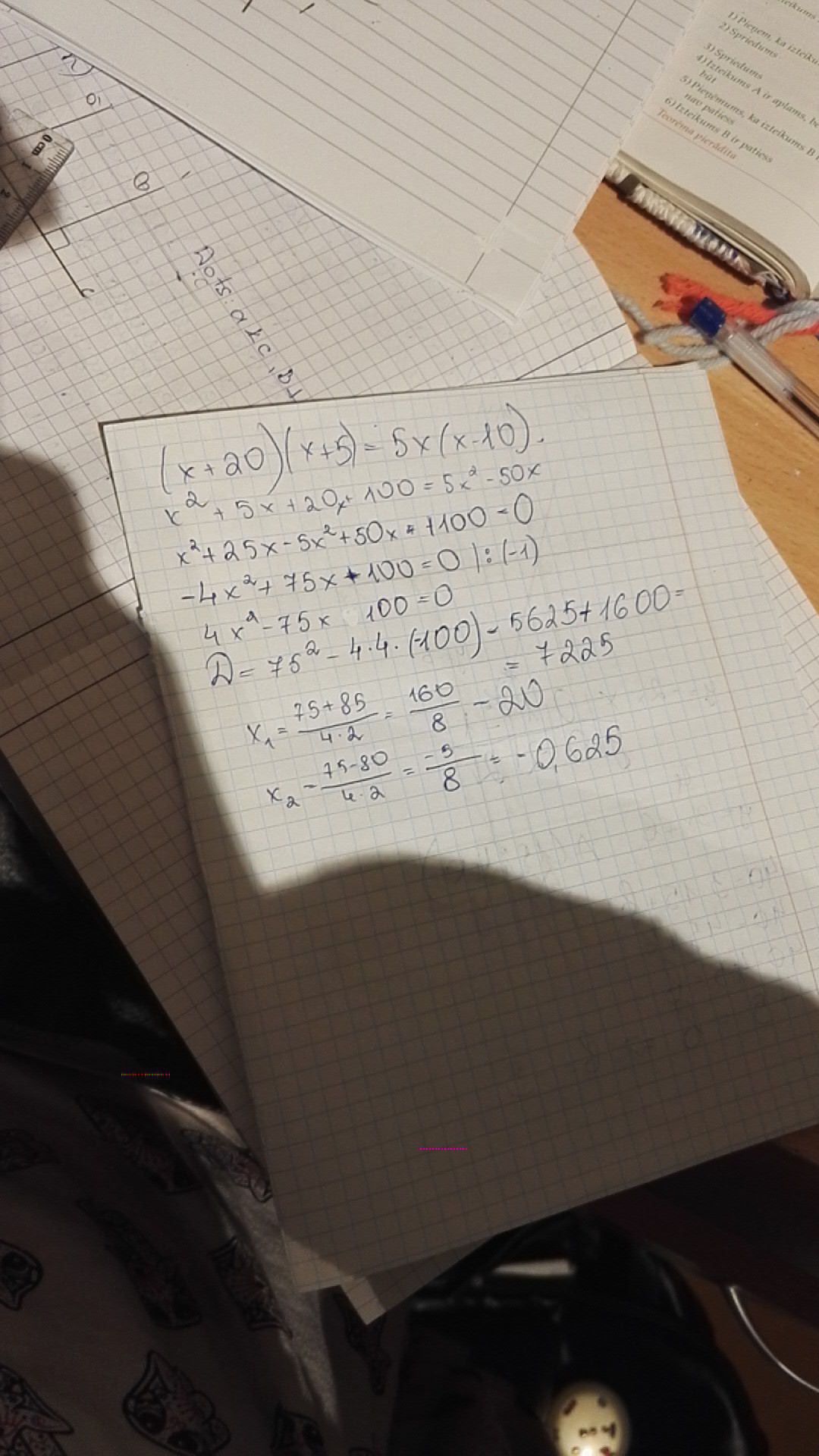 решить уравнение (х+20)•(х+5)=5•х•(х-10)