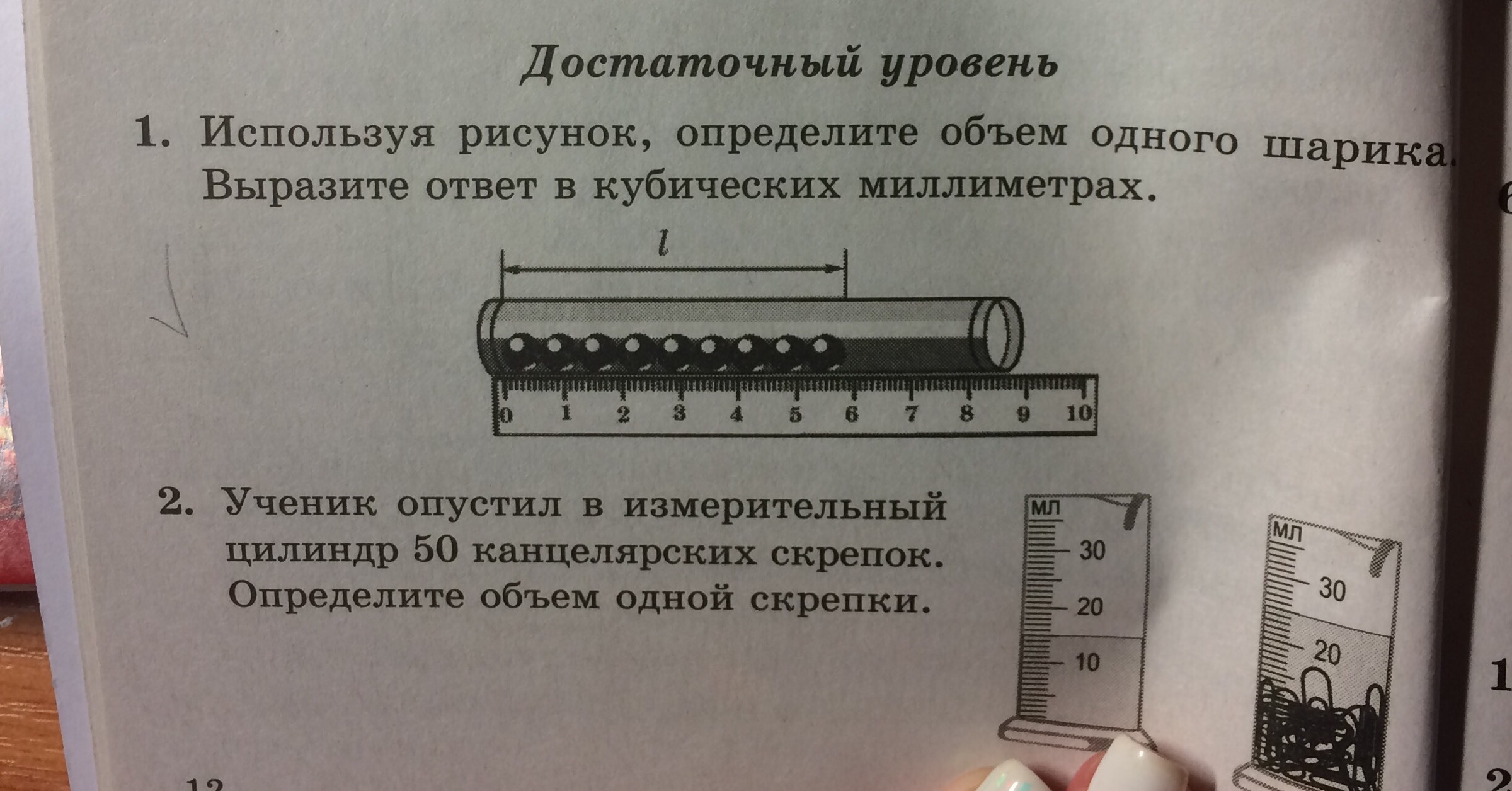 Используя рисунок, определите объём одного шарика. Выразите ответ в кубических метрах.