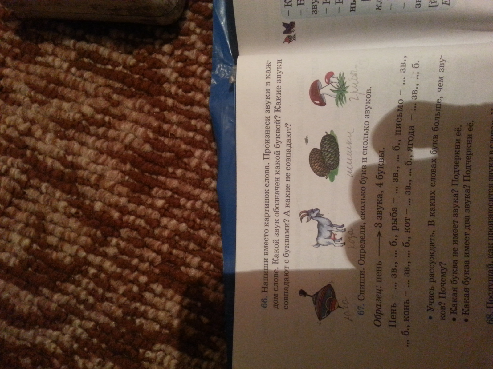 Рыба- 4б., 4 зв., письмо- 6б., 5зв., конь- 4б., 3зв., кот- 3б., 3зв., ягода-5б., 6зв. В русском языке существует транскрипция. В словах письмо и конь, Н и М мягкие, поскольку стоит мягкий знак, но он в транскрипции не отмечается, поэтому пишется что Н и М мягкие без мягкого знака. А в слове ягода, Я выступает в транскрипции и в говорении, как двойное гласное, то есть я это (й,а), поэтому 5 зв.