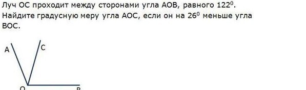 Луч ОС проходит между сторонами углов АОВ,равного 122 градуса.Найдите градусную меру угла АОС если он на 26 градусов меньше угла ВОС