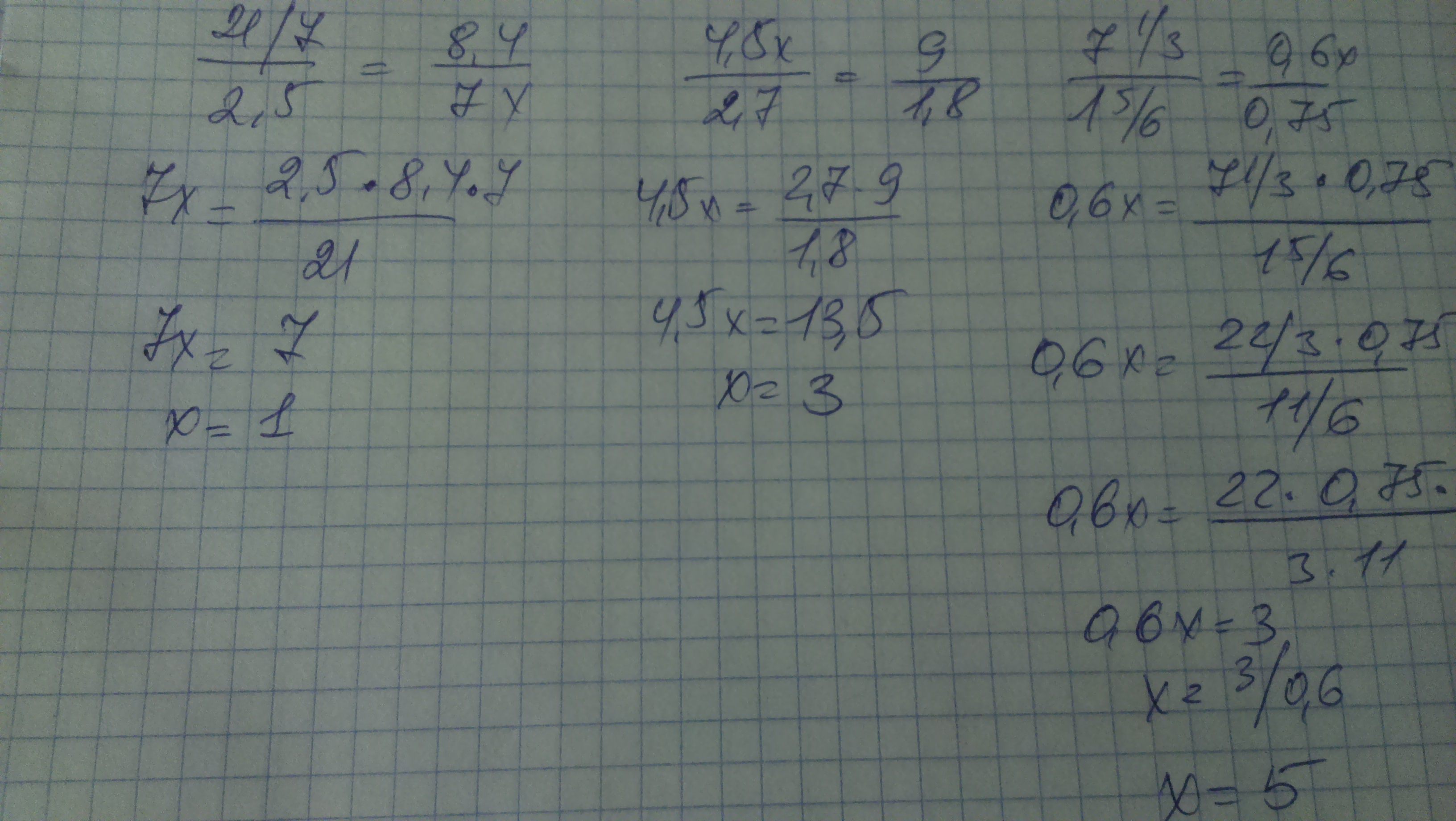 решите следующие пропорции: 2 1/7 : 2.5=8.4 : 7х; 4.5х : 2,7=9:1.8; 7 1/3 : 1 5/6=0.6х : 0.75