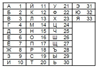 Ваня шифрует русские слова, записывая вместо каждой буквы её номер в алфавите(без пробелов). Номера букв указаны в таблице: