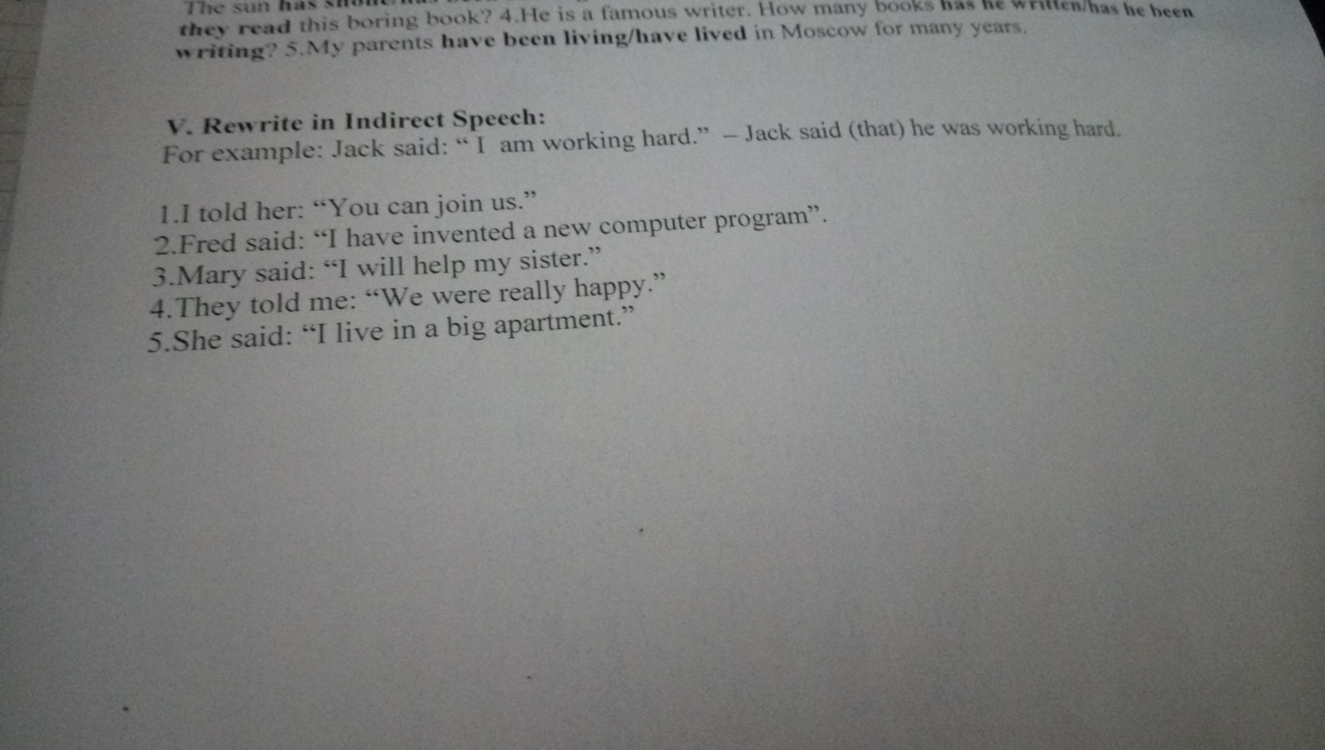 зачем мне перевод,мне нужно все эти предложения переделать в косвенную речь.