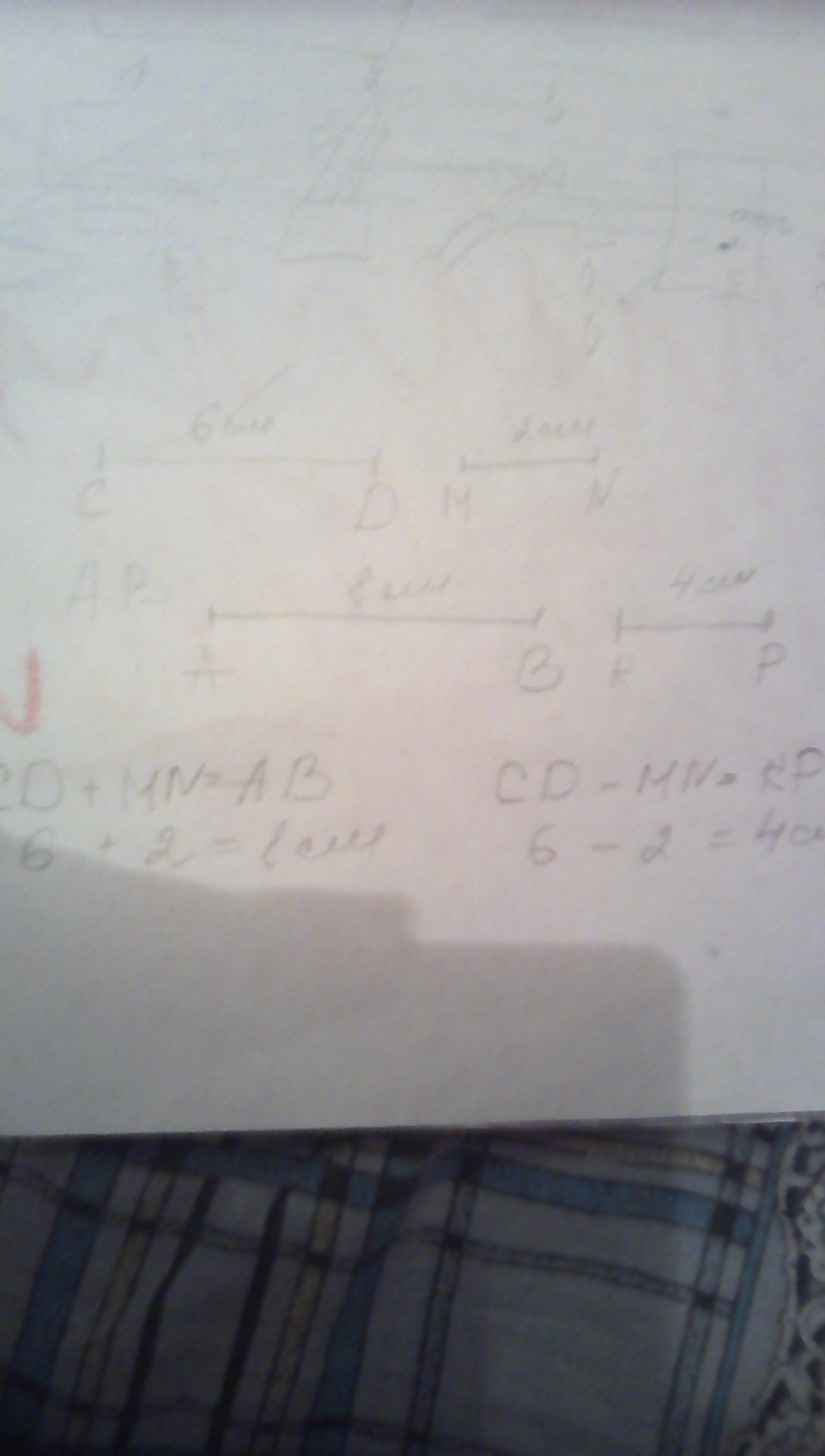 построй отрезок CD длиной 6 см и отрезок MN длиной 2 см Постройте 1)отрезок AB длина которого равна сумме длин отрезок 2)KP второй отрезок длина которого равна разность длин отрезков СД и MN