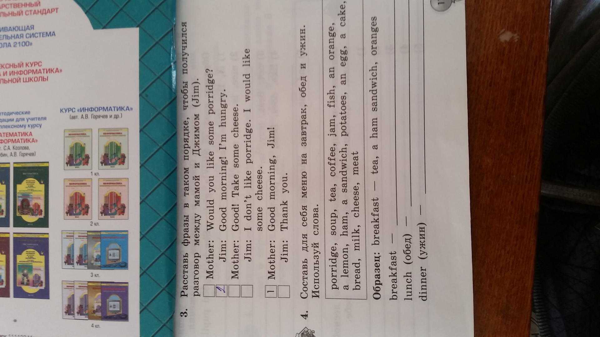 breakfast-(то,что можно поставить)porridge, tea,coffee,jam,oranges,ham,sandwiches, an egg,a cake,bread, milk,cheese.