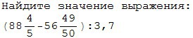 (88 4/5 - 56 49/50) : 3,7 = ( 444/5 - 2849/50 ) : 3,7 = 4440-2849/50 : 3,7 = 1591/50 : 3,7 = 31,82 : 3,7 = 8,6