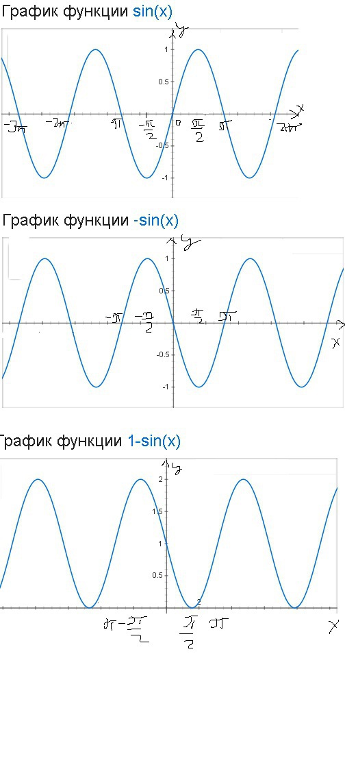 3) перемещаем график вверх на 1 относительно оси ОУ, получится график у=1-sinx