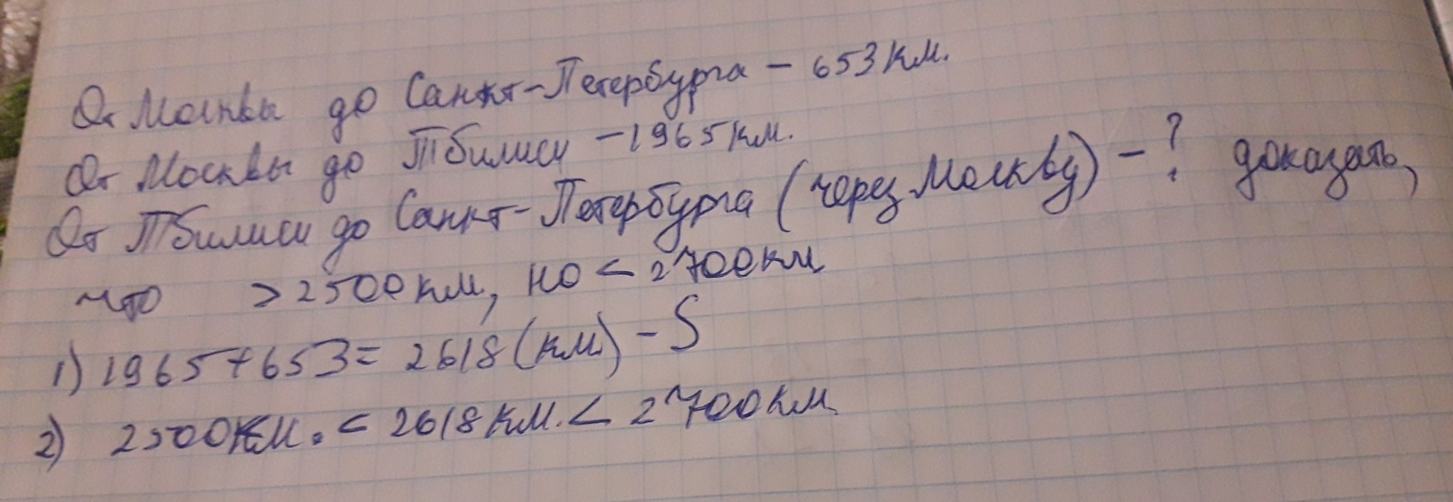От Москвы до Санкт-Петербурга 653 км,а от Москвы до Тбилиси 1965 км.Докажи,что Санкт-Петербурга до Тбилиси через Москву больше,чем 2500 км,но меньше ,чем 2700 км.