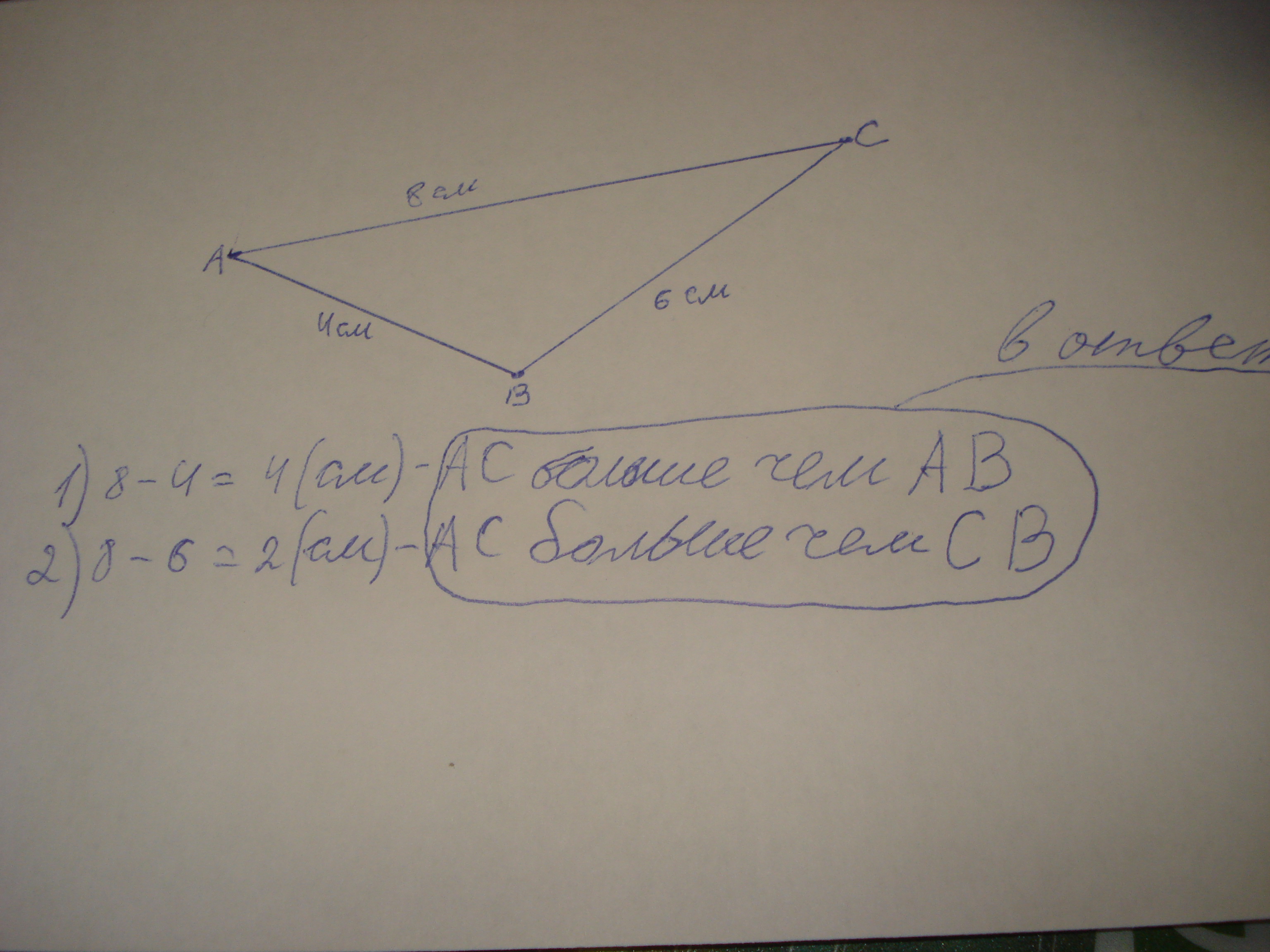 помогите решить задачу Нарисуй тупой угол. На одной его стороне отложи 4 см, а на другой - 5 см. Соедени концы этих отрезков. Измерь длину полученного отрезка и сравни её с длинами двух других отрезков.