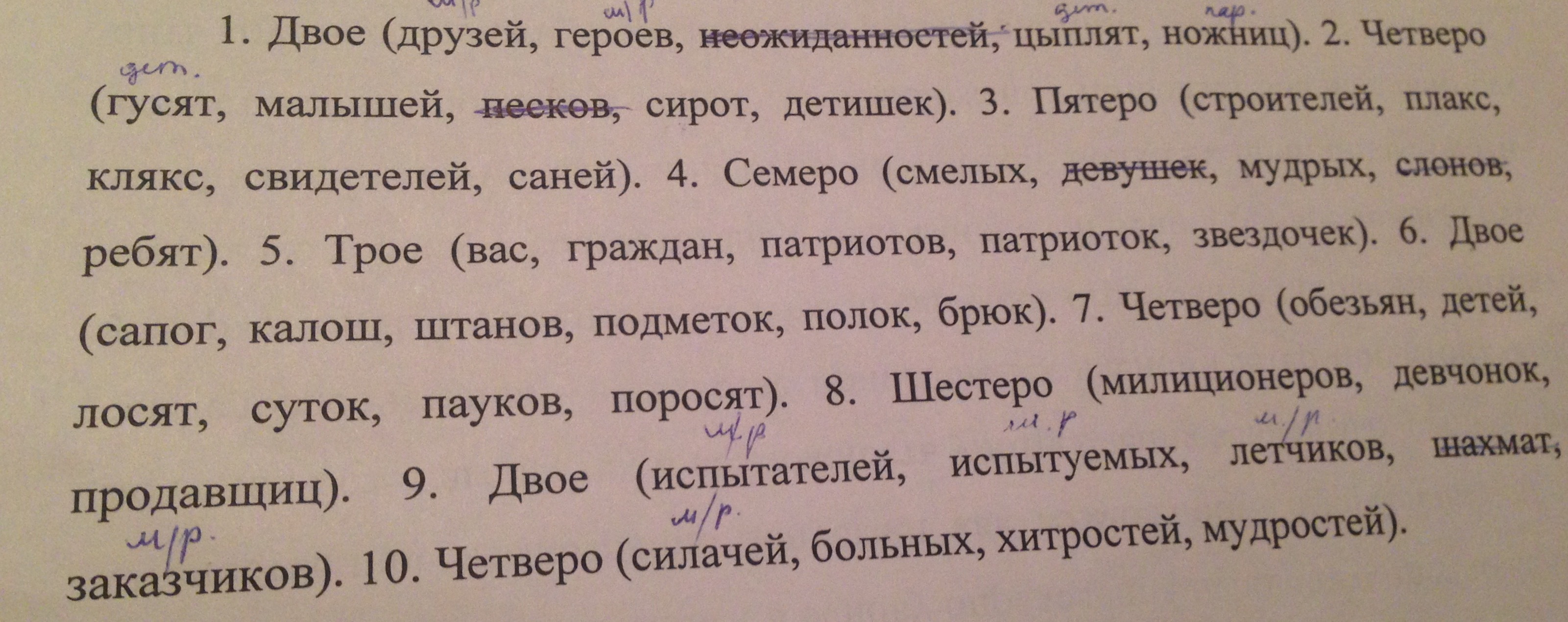 Тут надо найти в скобках слова,которые не могут сочетаться с собирательными числительными!!!