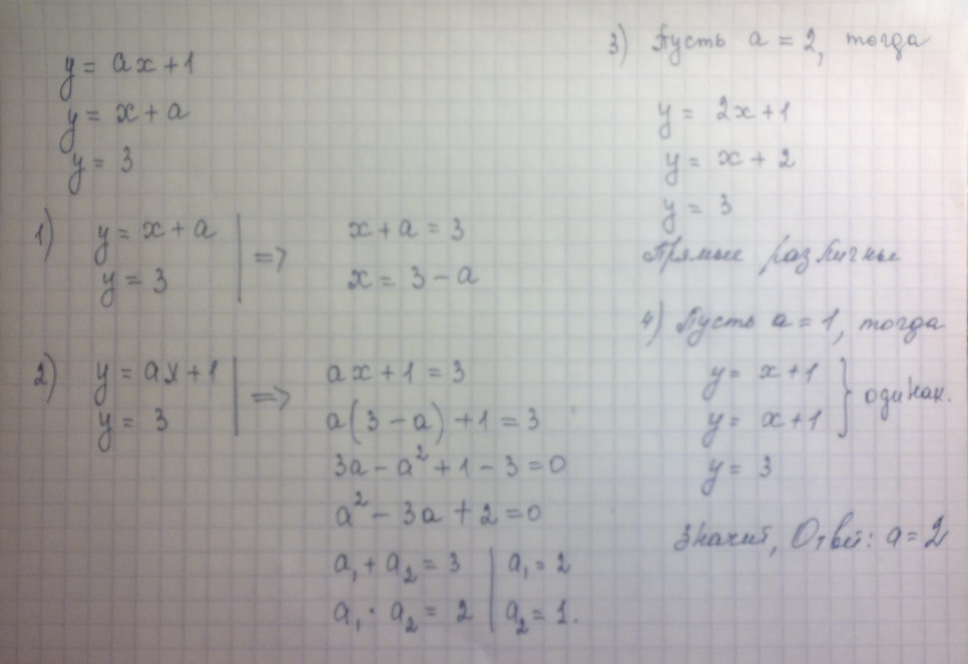 Число а таково,что прямые у=ах+1, у=х+а и у=з различны и пересекаются в одной точке. Каким может быть а?