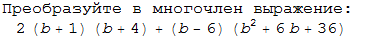=2(b^2 + 4b +b +4) + (b^3 - 6b^2 - 36 - 6b^2 +36b -216)= 2(b^2 + 5b + 4) + b^3 + 12b^2 -213 = 2b^2 + 10b + 8 + b^3 + 12b^2 -216 = b^3 +14b^2 +10b -208