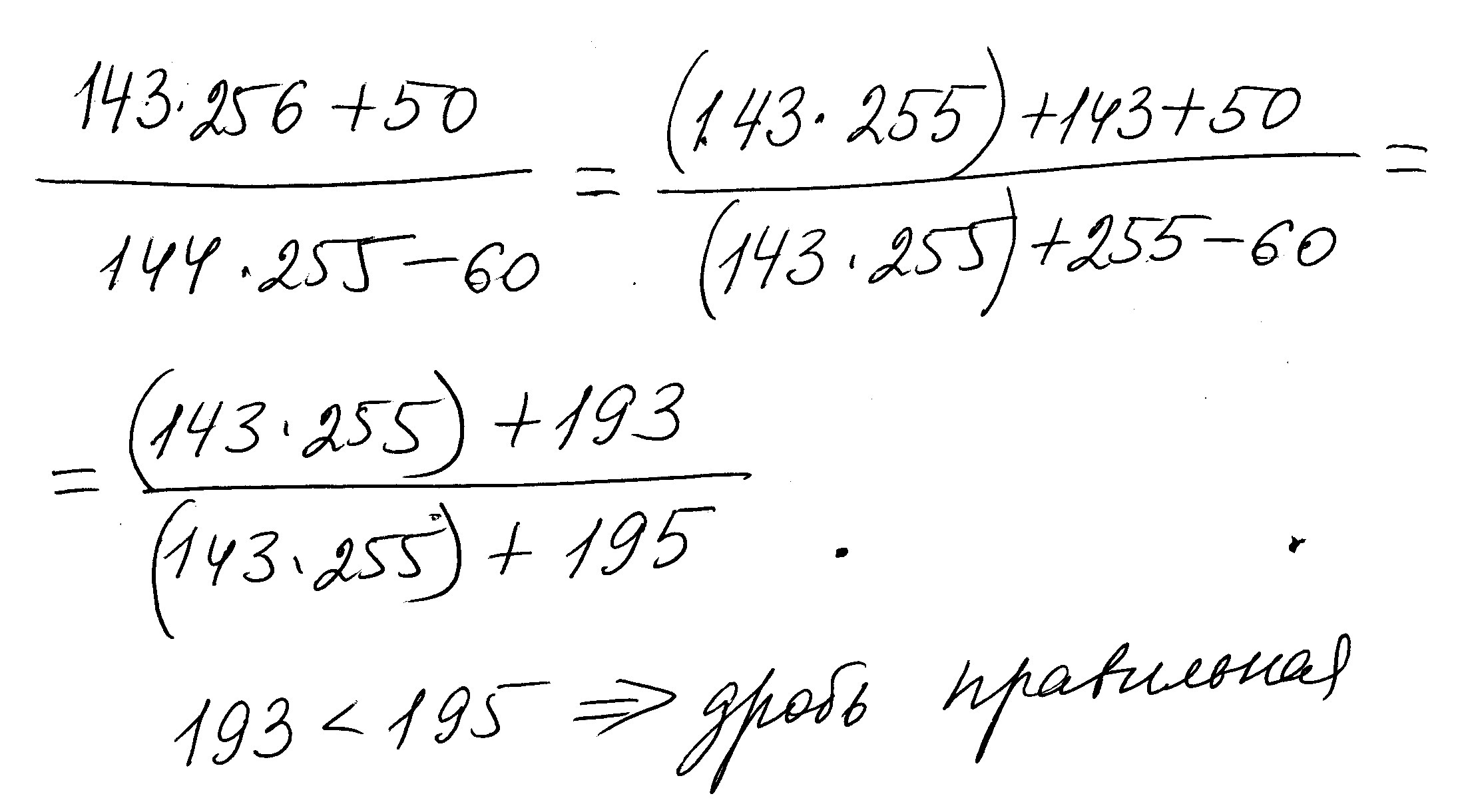 Не вычисляя числитель и знаменатель дроби 143*256+50/144*255-60, установить является ли данная дробь