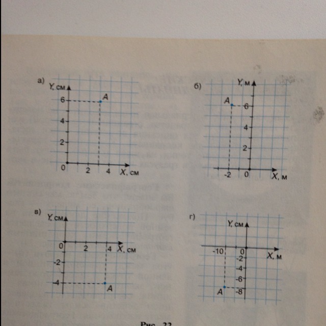 На рисунке 22,а,Б,в,г показаны положения тела на плоскости. Запишите значения координат тела для каждого случая
