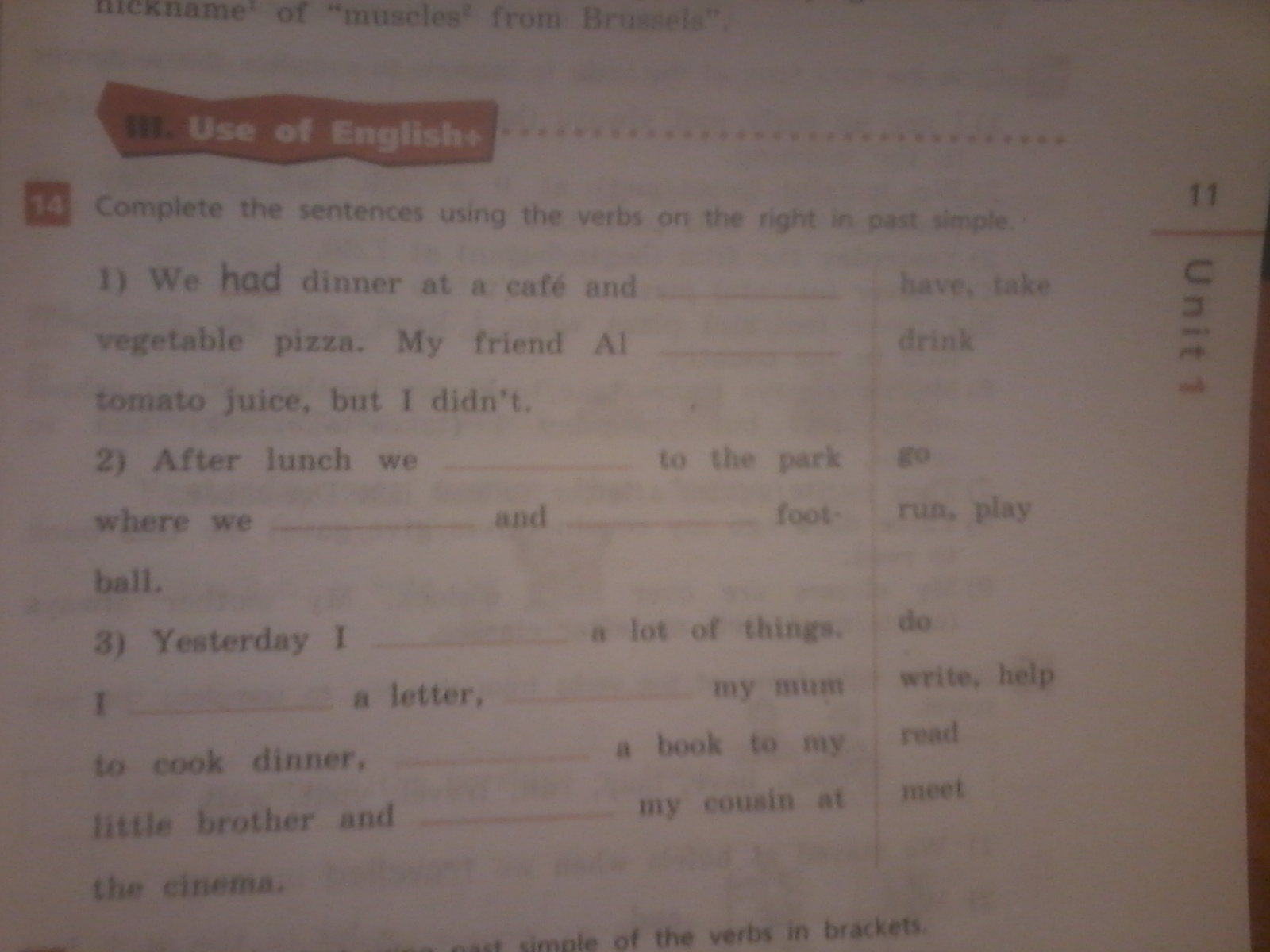 Вчера я много чего сделал. Я написал письмо, помог маме приготовить ужин, почитал книгу моему маленькому брату и встретил кузена в кино