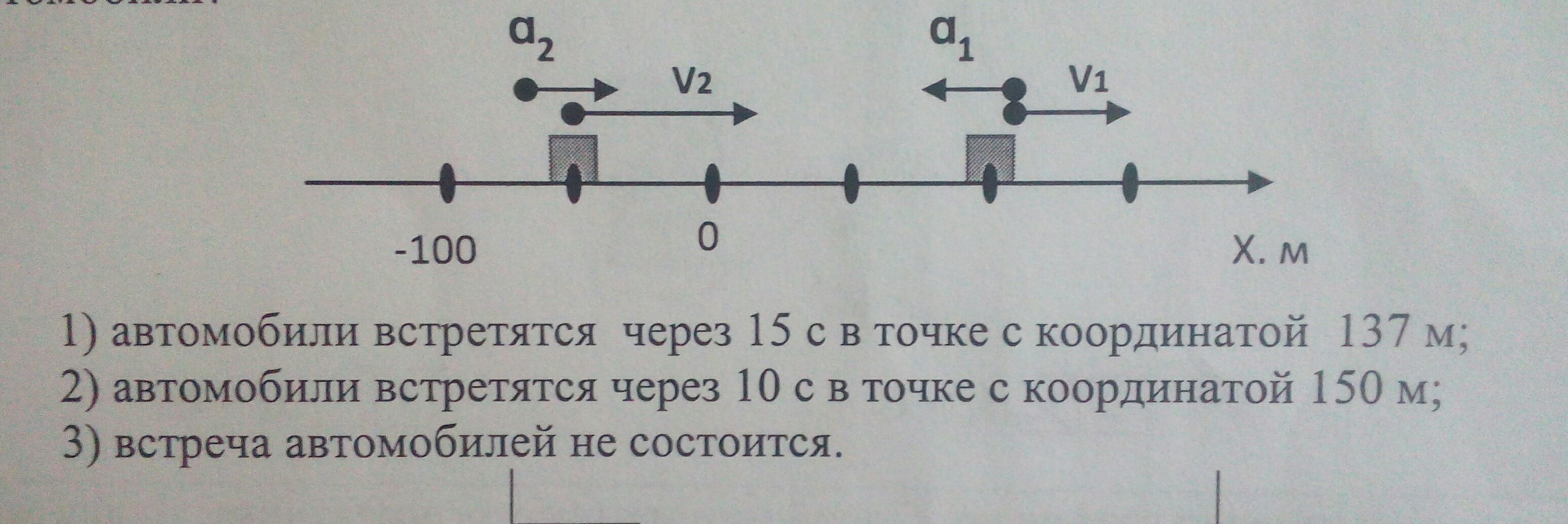 На рисунке показаны положения автомобилей и направления их скоростей и ускорений в момент времени t=0. Известно что V1=10м/с, V2=15м/с, a1=a2=1м/с(в квадрате). Встретятся ли автомобили?