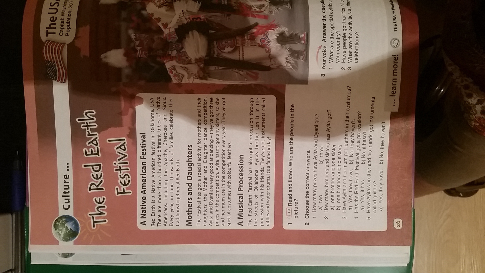 Также, на фестивале "Красной земли" по улицам Оклахомы проходит процессия. Брат Айиты Лен участвует в процессии со своими друзьями. У них есть музыкальные инструменты, так называемые трещотки и водные барабаны. Прекрасный день!