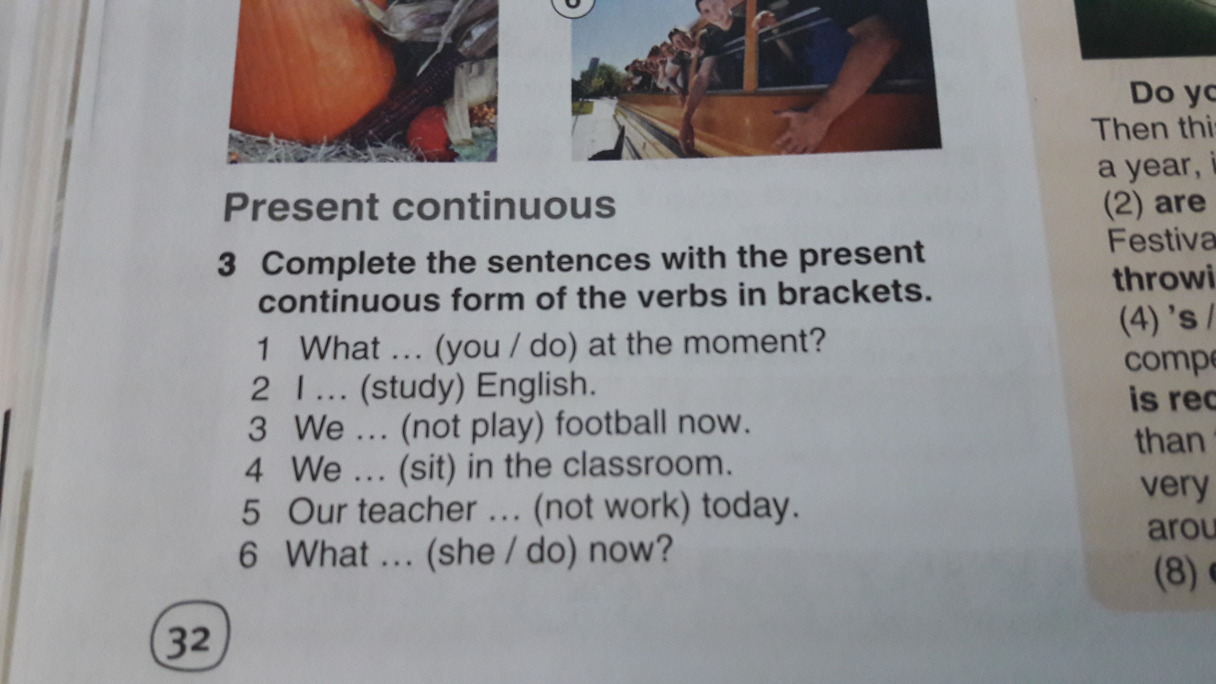 (3) 1. Are you doing 2. Am studying 3. Aren't playing 4. Are sitting 5. Isn't working 6. Is she doing (4) 1. Always do 2. 're writing 3. 'm doing 4. Don't cycle 5. Isn't raining 6. Visit (5) 1. Are you going out this evening? 2. Is your mum working tomorrow? 3. Are you meeting friends at the weekend? 5. Is your teacher going on holiday next week? 6. Are you going to university next year? (6) сами ответе, там индивидуально. (7) 1. Do you like 2. Celebrate 3. Throwing 4. 's 5. Receives 6. Is 7. Visit 8. Eating. Эти задания легкие, поэтому сделала все, но на будущее когда столько много заданий, лучше разделяйте их на несколько вопросов