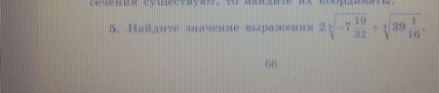 2 sqrt[5]{- 7frac{19}{32} } + sqrt[4]{39 frac{1}{16} } =2 sqrt[5]{- frac{243}{32} } + sqrt[4]{frac{625}{16} } =2*(- frac{3}{2} )+ frac{5}{2} =-3+2,5= \ =-0,5= frac{1}{2}