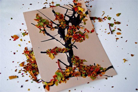 Нарисуй черное краской ствол и ветки, потом намажь клеем места на листе, где должны быть листья. Набери сухих листьев, измельчи и насыпь на лист с клеем. Получится очень красивое осенне дерево.