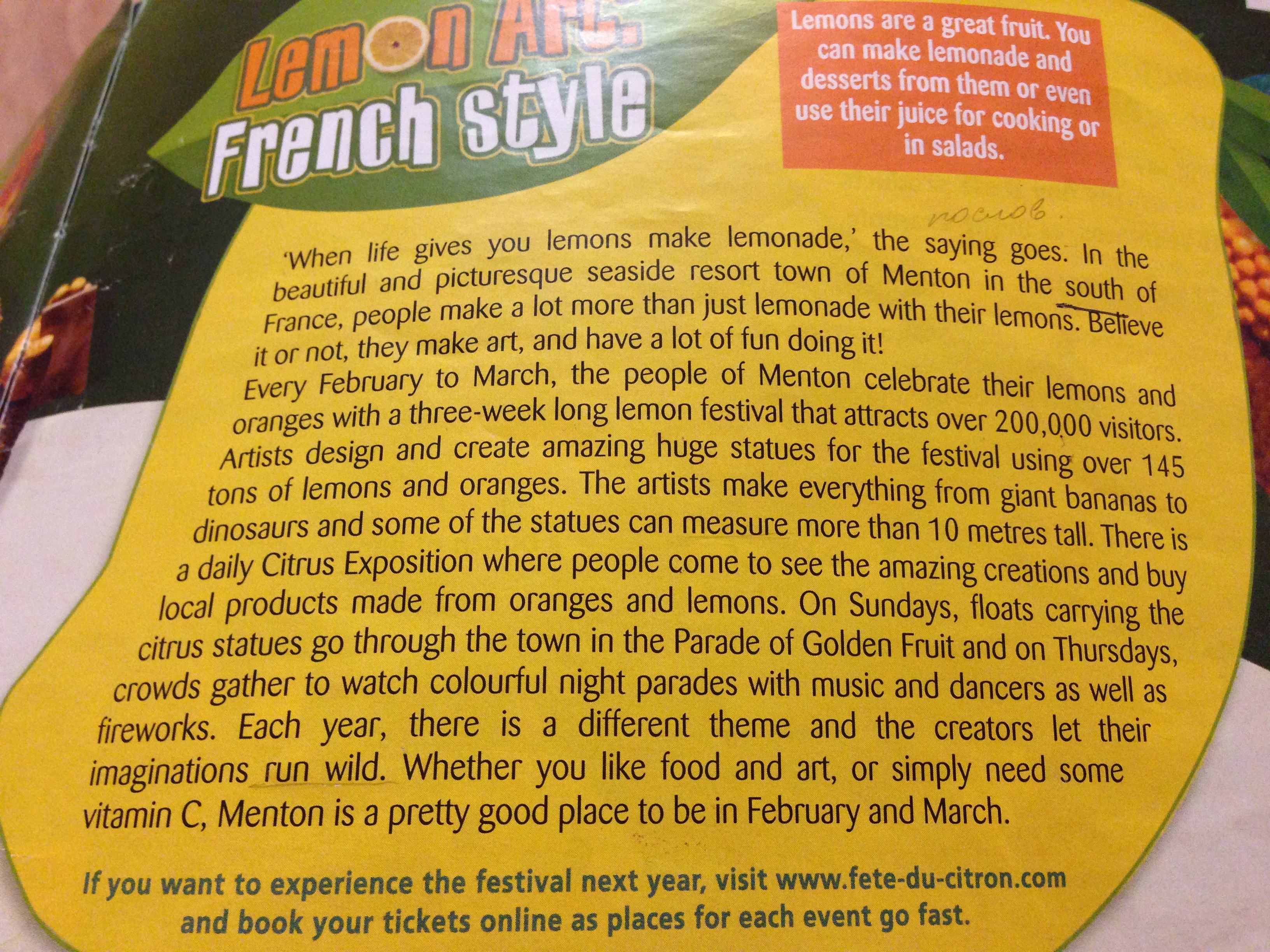 "Когда жизнь дарит вам лимоны сделать лимонад", пословица.В красивом и живописном курортном городе Ментон на юге Франции, люди делают лимонад из их лимонов.Верьте или нет, они делают искусство, и они всегда делают это весело.Каждый февраль и март, народ Ментона отмечает свои лимоны и апельсины после трех-недельного фестиваля который привлекает более 200000 посетителей. Художники создают дизайн и удивительно огромные статуи на фестиваль, используя более 145 тонн лимонов и апельсинов. Художники делают все от гигантских бананов и динозавров, и некоторые из статуй могут быть более 10 метров в высоту.Там это ежедневная Цитрусовая Экспозиция, где люди приходят, чтобы увидеть удивительные творения и купить местные продукты из лимонов и апельсинов.По воскресеньям, цитрусовые сатуи проходят через весь город в параде Золотых фруктов и по четвергам, толпы собираются, чтобы посмотреть красочный ночной парад с музыкой и танцами и с фейрверками. Каждый год,есть другая тема и фантазия у создателей разыгрывается.Любите ли вы еду или искусство или вам нужен витамин С, Ментон является хорошим местом, чтобы побывать там в феврале и марте.