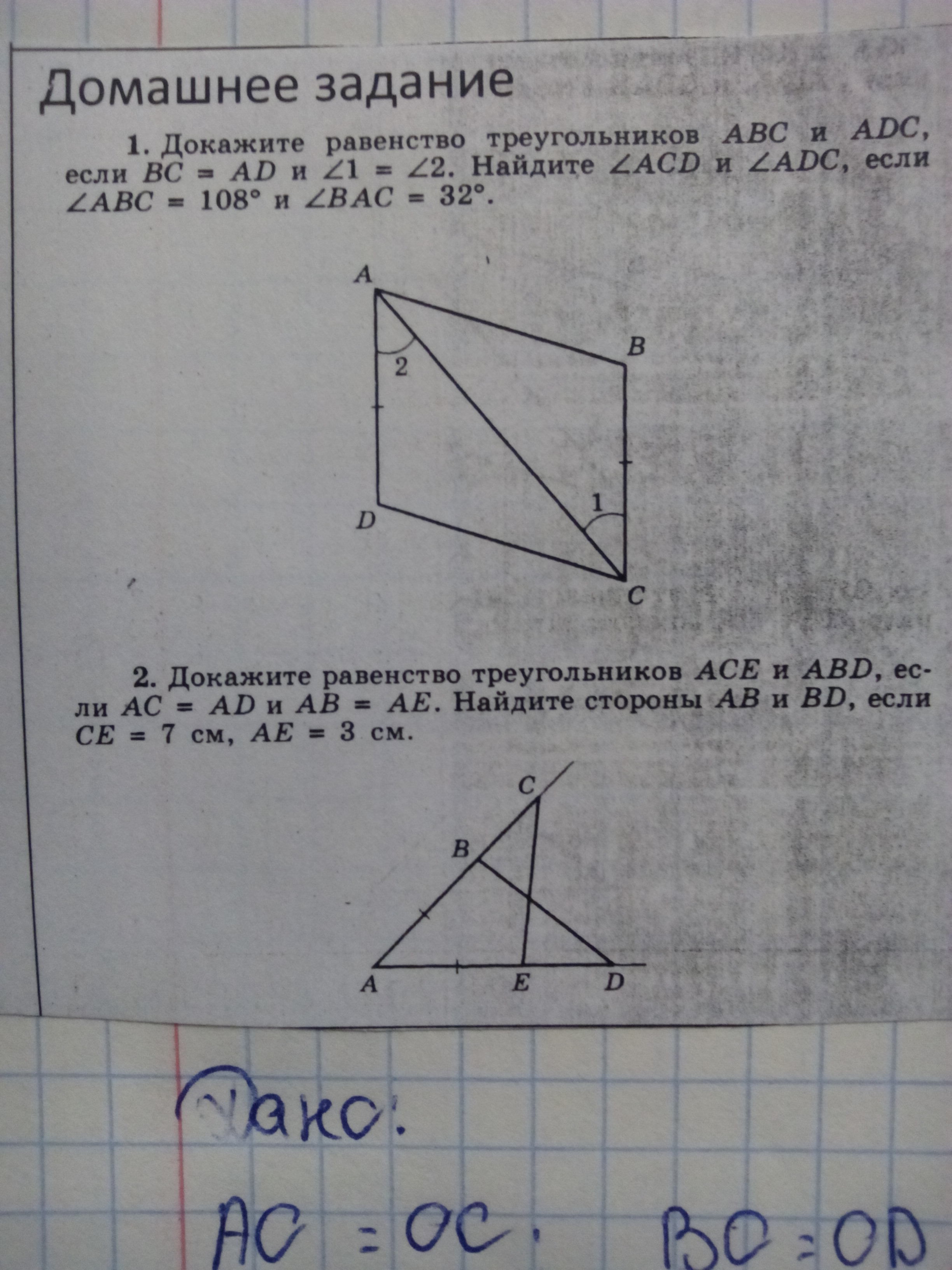 Треугольник равен по 2 углам и стороне между ними,ACB=180-108+32=40,ADC=108,т.к треугольники равные.