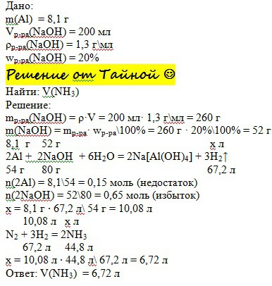 Какой объем аммиака можно получить, если для его синтеза использовать водород, выделяющийся при взаимодействии 8,1 г алюминия с 200 мл раствора с плотностью 1,3 г/мл и массовой долей гидроксида натрия 20%.