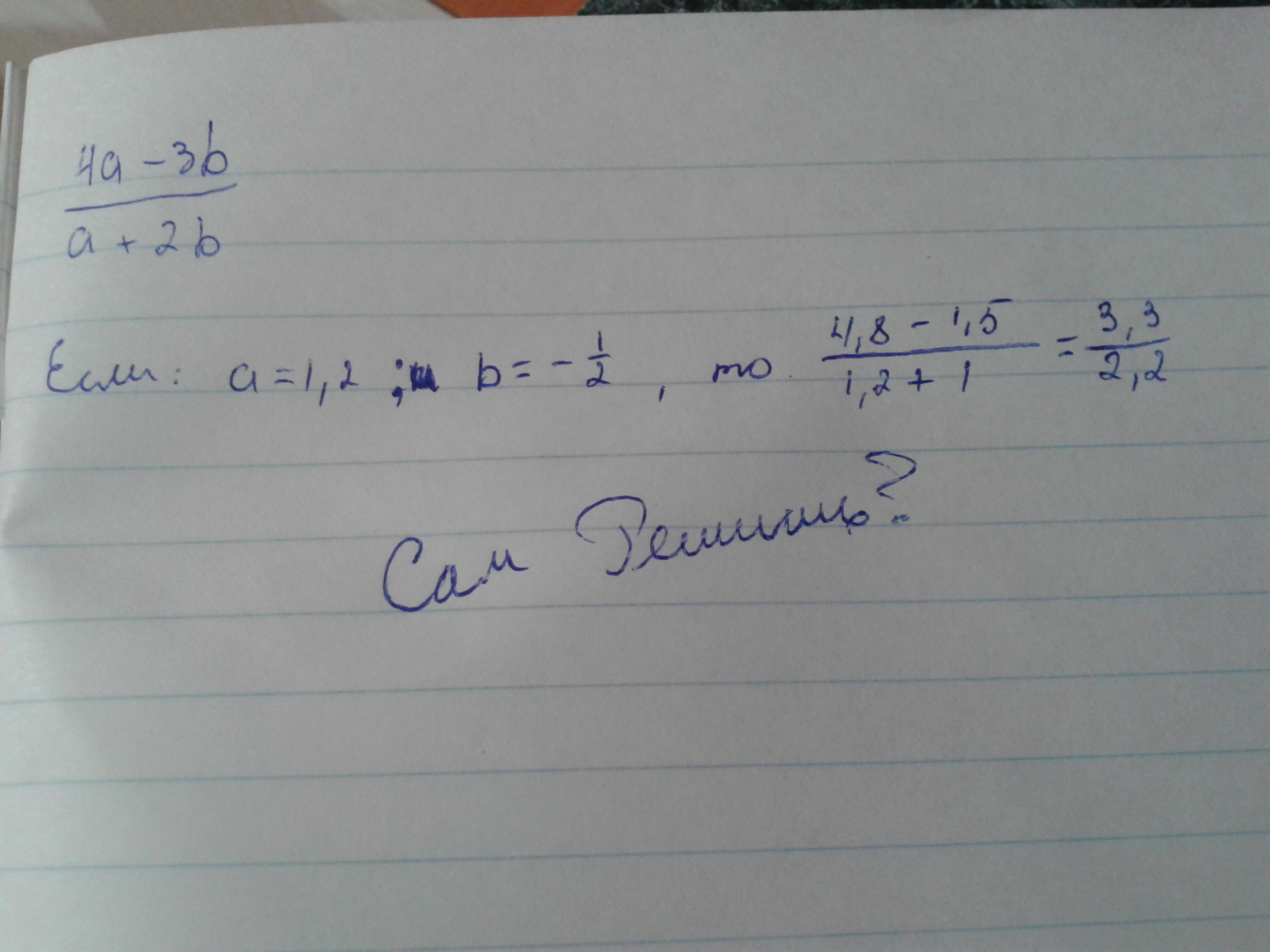укажите допустимые значения переменных в выражении 4а-3b/a+2b и найдите его значение при а =1,2 и b=-1/2