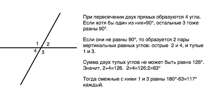 найдите неразвернутые углы, образованные при пересечении двух прямых, если сумма двух из них равна 126 градусам.