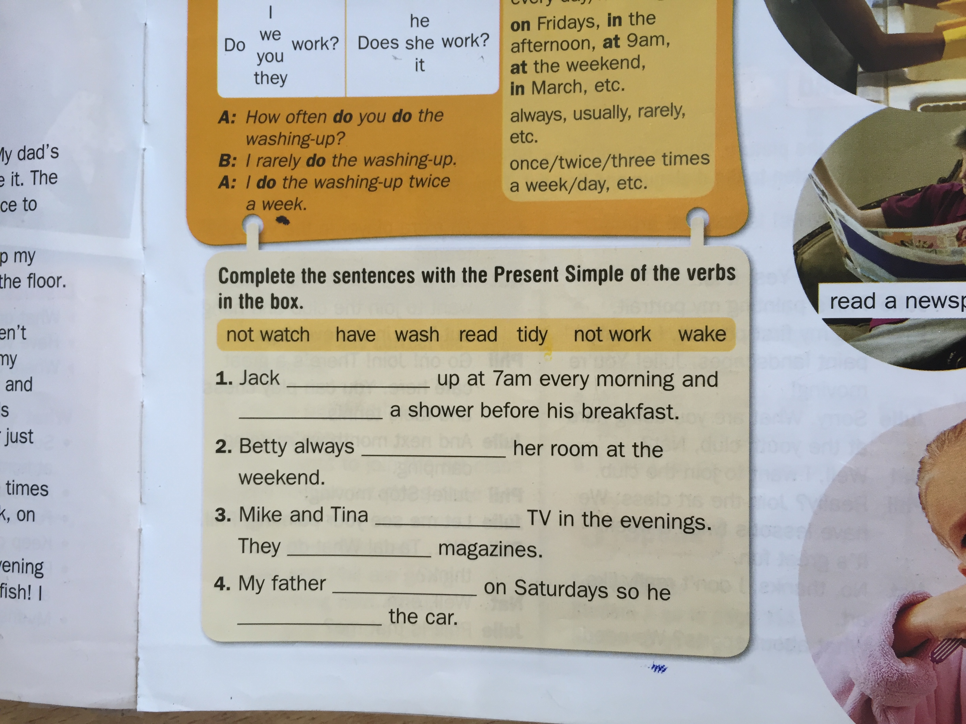 4 My father doesn't work (мой папа не работает)... he washes the car (он моет машину).