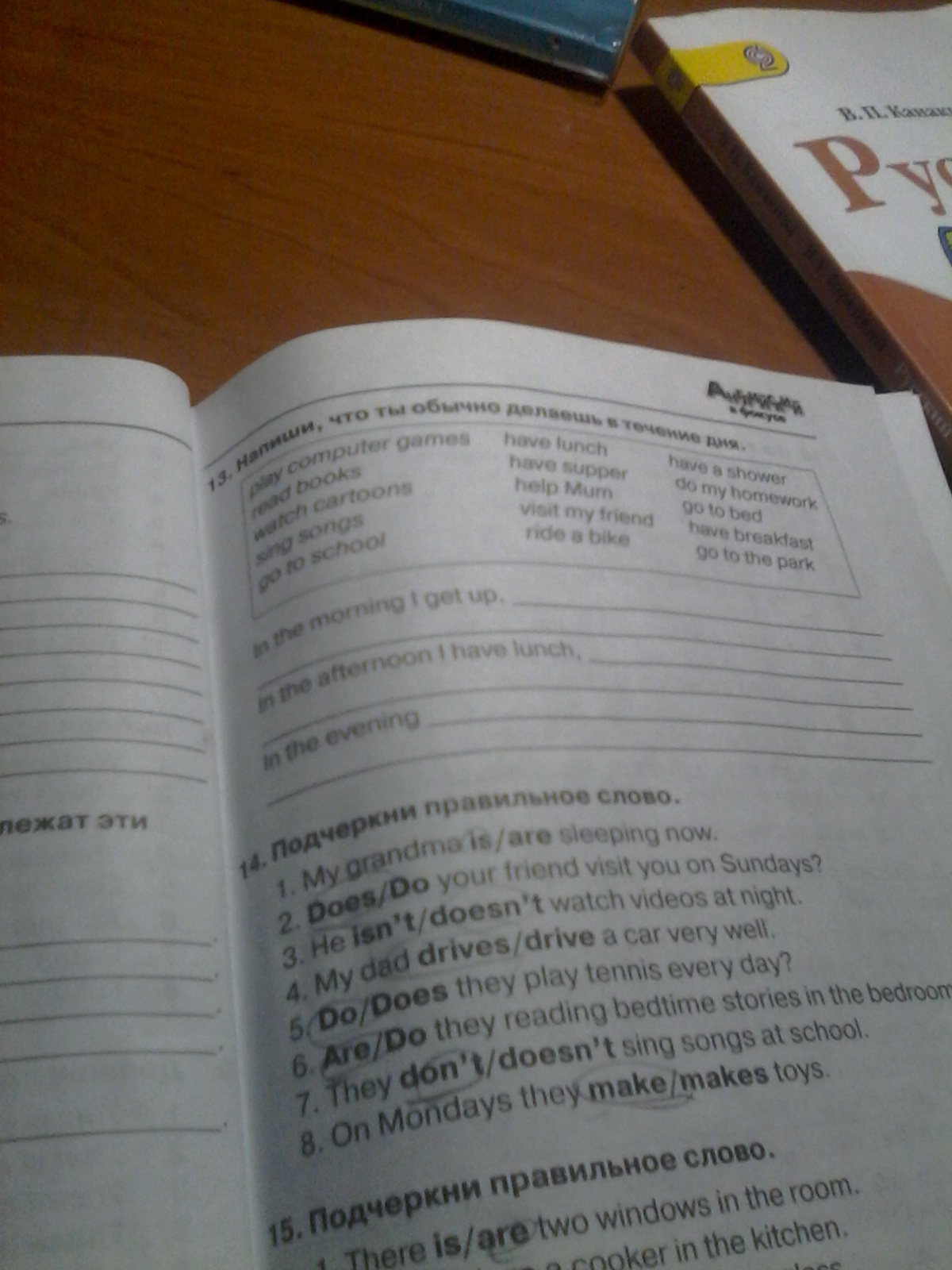 Днем я обедаю, помогаю маме, делаю домашнее задание и навещаю друга (подругу).