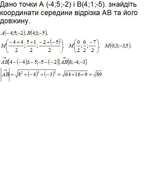 Дано точки А (-4;5;-2) і В(4;1;-5). знайдіть координати середини відрізка АВ та його довжину.