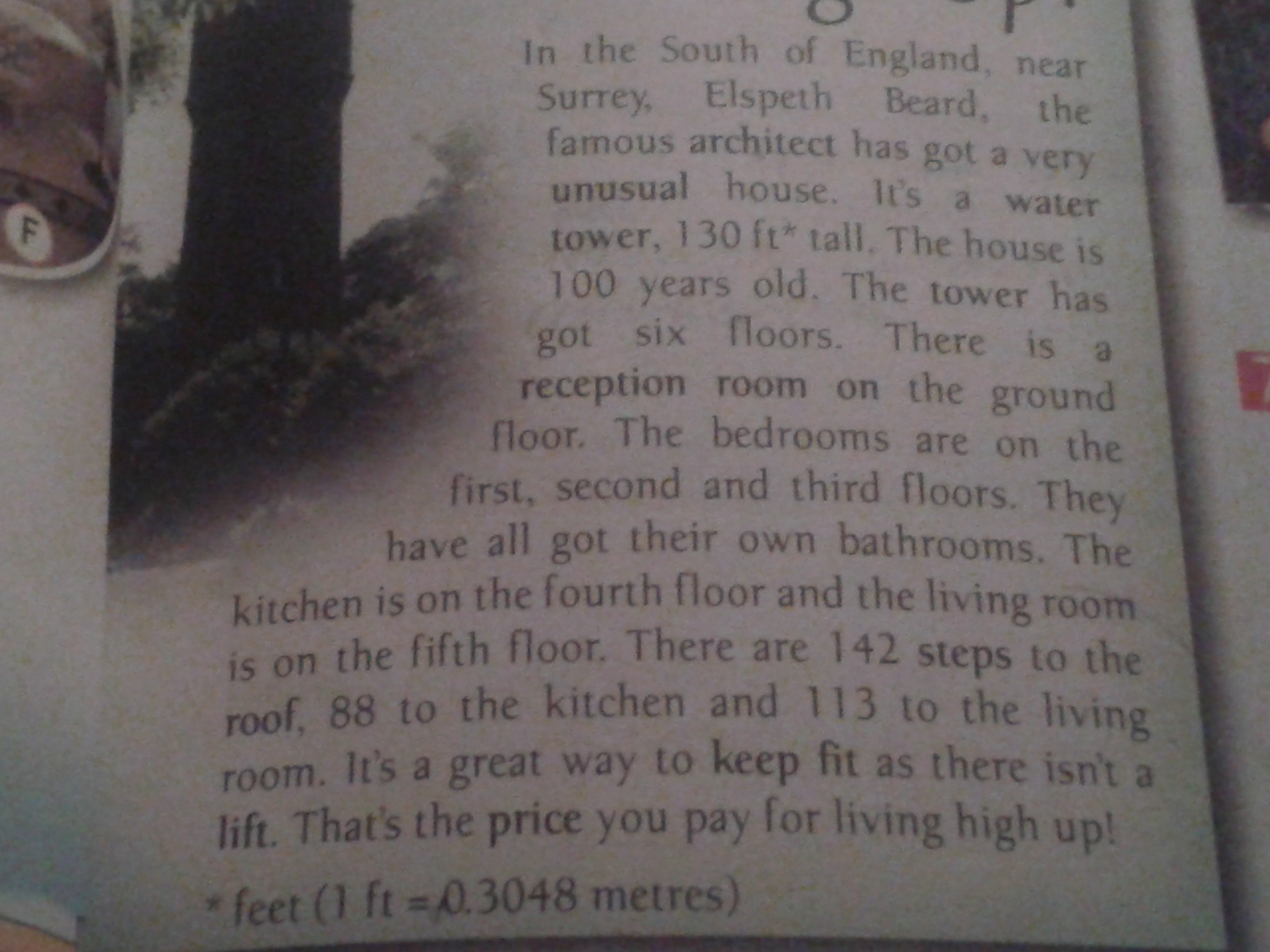 На в Англии, рядом с ( названия места), у знаменитого архитектора был необычный дом. Это водяная башня в высоту 130 футов.Башня имеет 6 этажей. Там есть прихожая на этаже,который не первый а еще ниже. Спольни на первом на втором и на третьем. И все они с балконами. Они снабжены ванными. Кухня на 4 этаже и жилая комната на 5. Там 142 ступенек на крышу,88 на кухню и 113 в жилую комнату.