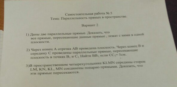 1) Две данные параллельные прямые образуют плоскость. Каждая прямая пересекающая данные параллельные прямые имеет 2 точки, принадлежащие этой плоскости, это точки пересечения каждой прямой с этими параллельными прямыми. Если две точки прямой принадлежат плоскости, то и вся прямая принадлежит плоскости. И так, 2 параллельные прямые и каждая прямая их пересекающая лежат в одной плоскости, плоскости , образованной параллельными прямыми.