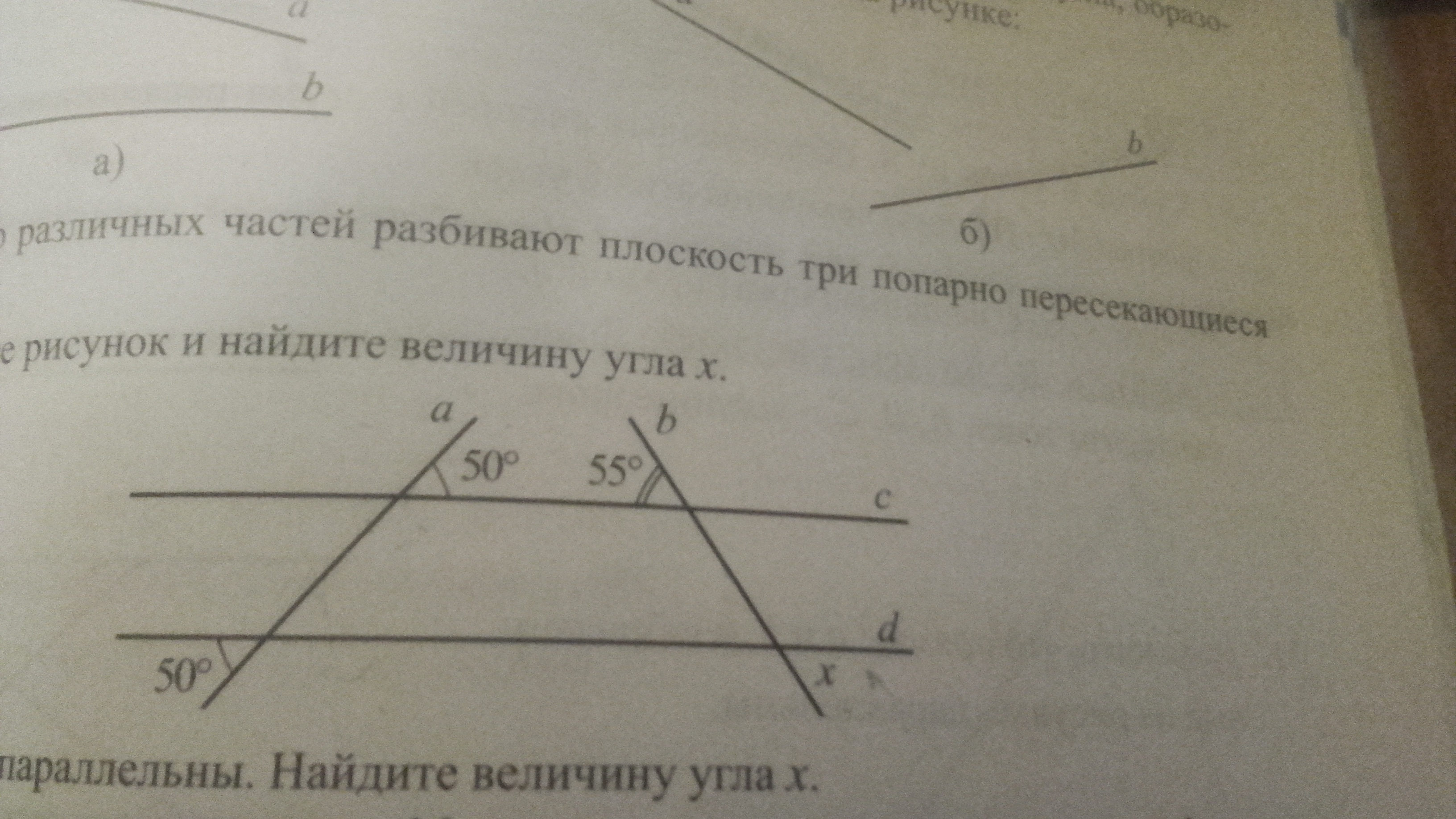 x= 55 градусов потому что x это угол поролельный тому, который уже известен и имеет велечину 55 градусов. значит они одинаковы