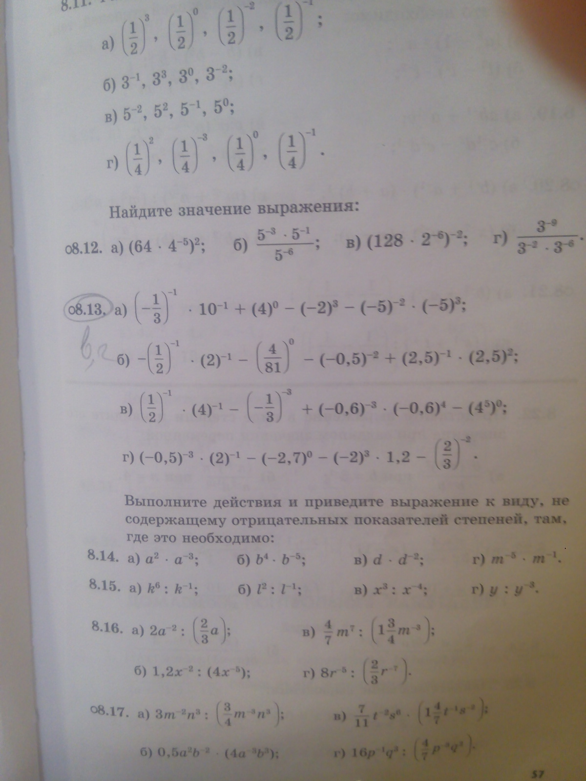 число в отрицательной степени равно единице,деленной на это число и все в данной степени, любое число в нулевой степени равно единице, при умножении одинаковых чисел с разными степенями - степени складываются,основание остается прежним