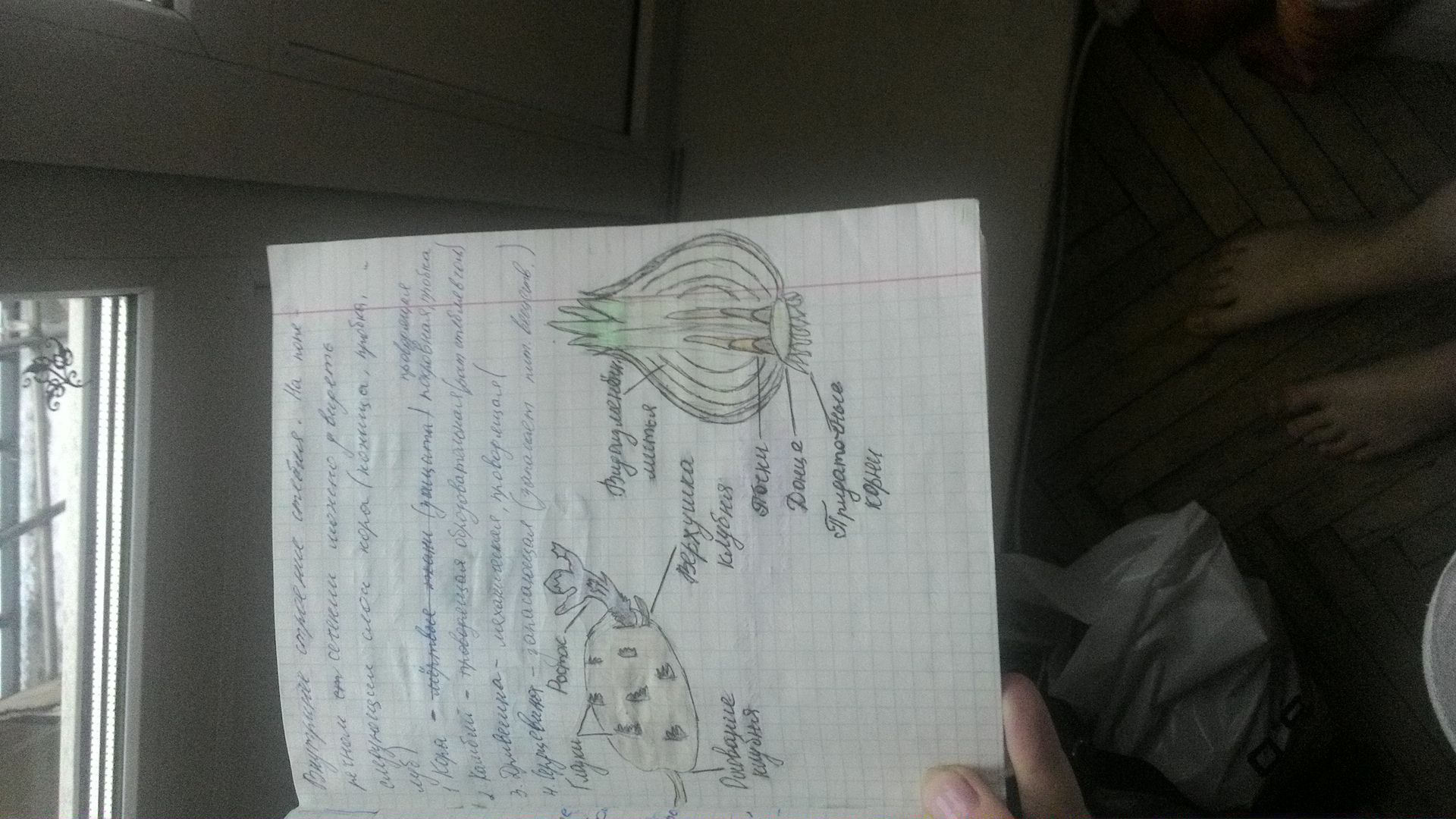 Разрежьте луковицу вдоль и рассмотрите ее строение. Найдите укороченный стебель – донце, почки и придаточные корни.