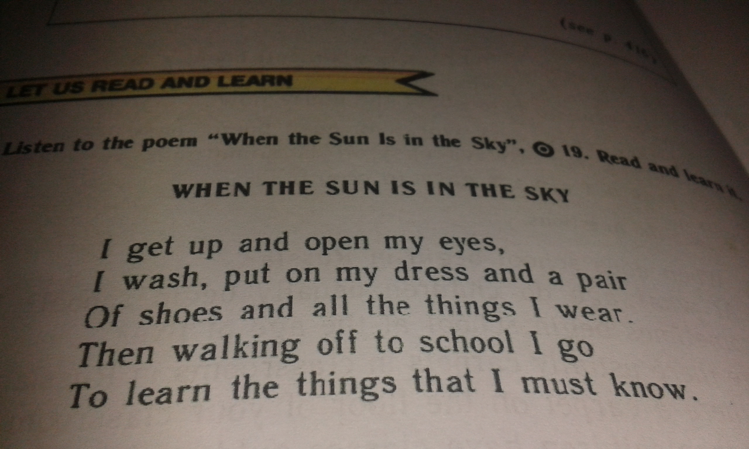 НАЗВАНИЕ: Вэн зе сан ис ин зе скай Ай гет ап энд оупэн май айз, Ай вош, пут он май дрес энд э пейр, оф шоуз энд олл зе тинкс ай вэр. Тэн волкин оф ту скул ай гоу, Ту лён зе тинкс тэт ай маст нов