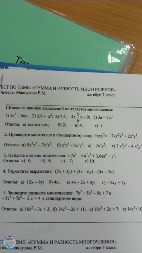 5 номер не заметил.7c^3+5c^2-5c+7+5c^2-7c^3+2c-4=10c^2-3c+3.Ответ:а