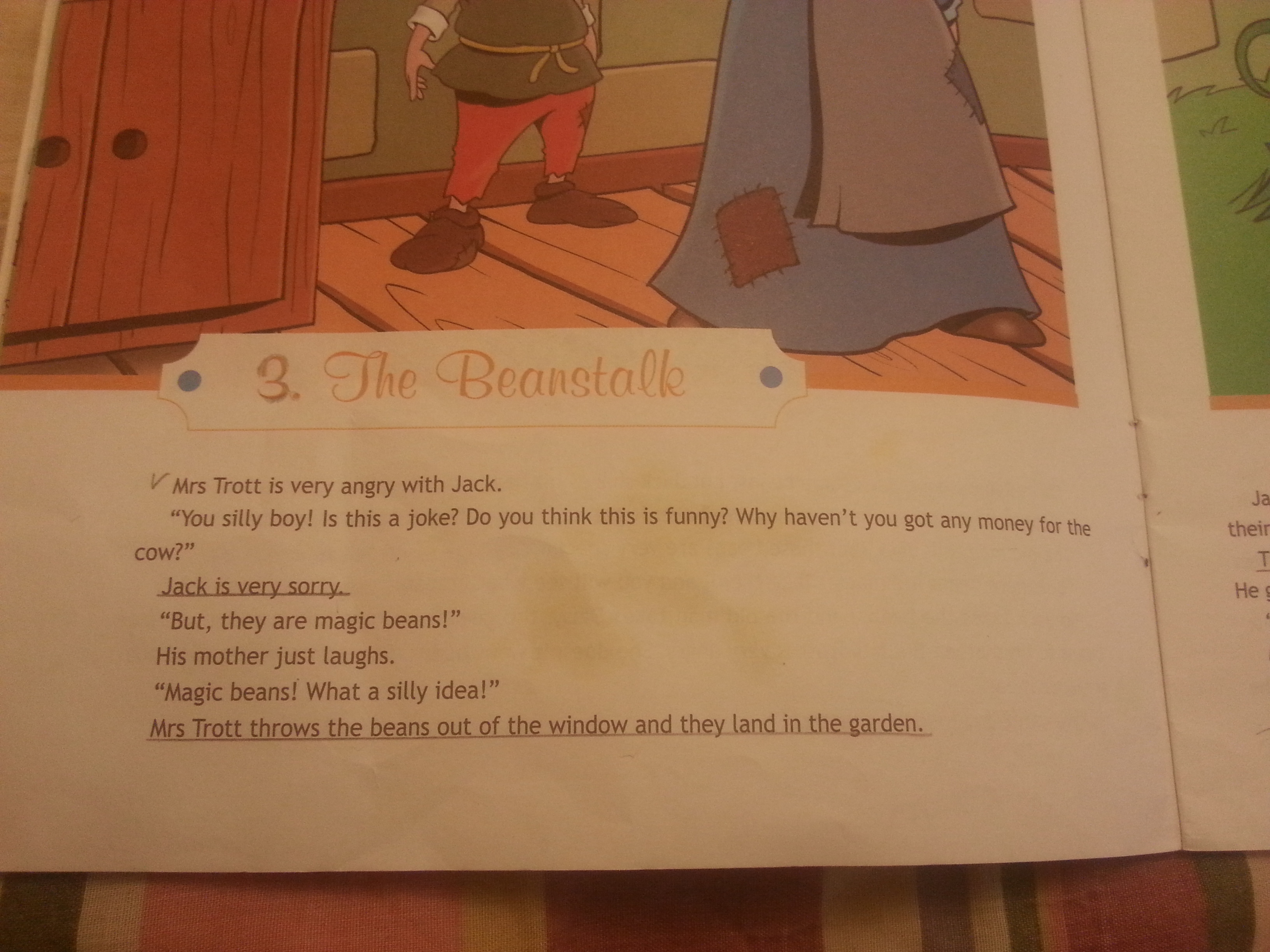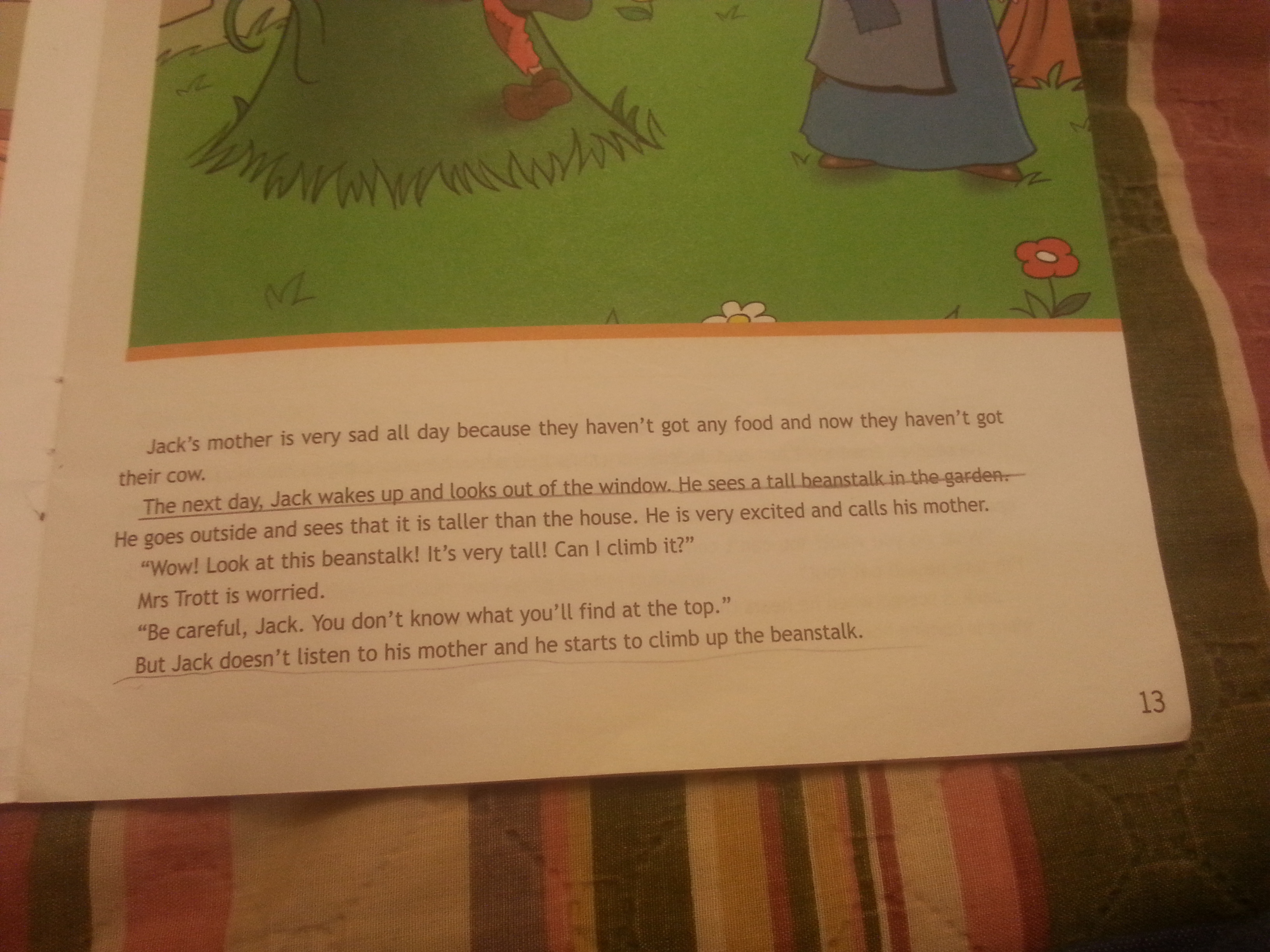 "Ух ты! Посмотри на ЭТОТ бобовый стебель! Он чрезвычайно высокий! Можно мне туда залезть? "