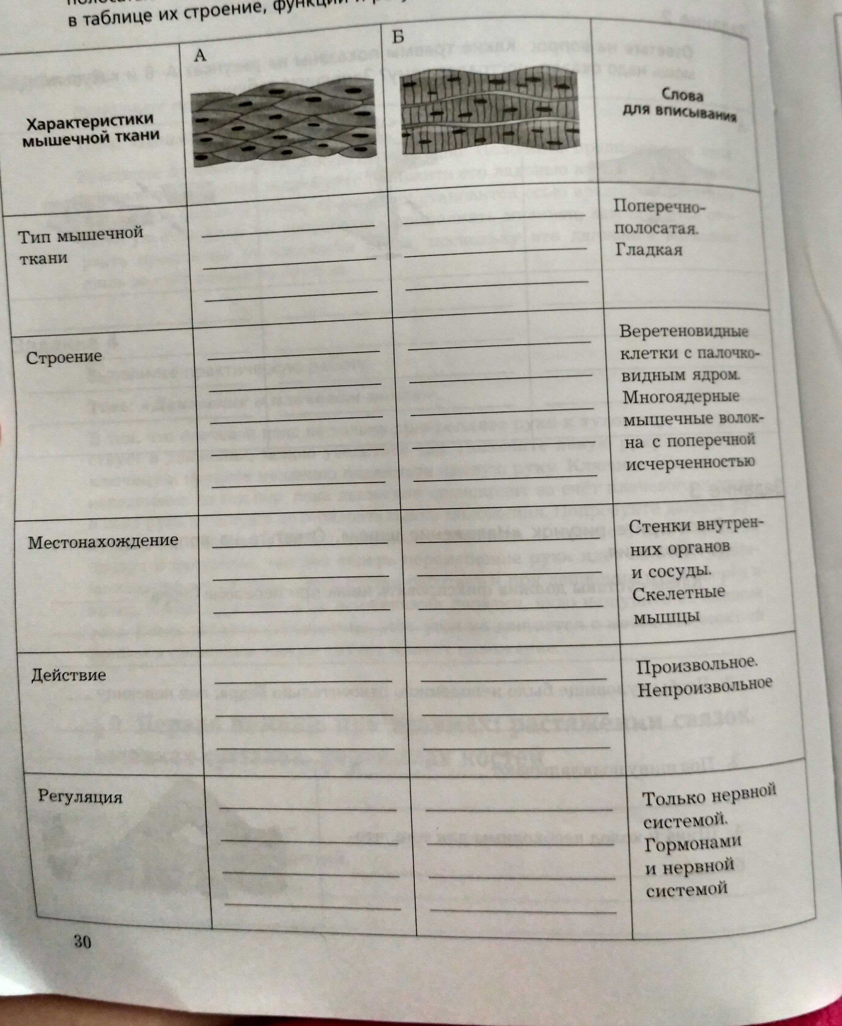 Определите где на рисунках изображены поперечно-полосатые мышечные волокна, а где - гладкие мышцы. Кратко опишите в таблице их строение, функции и регуляцию.