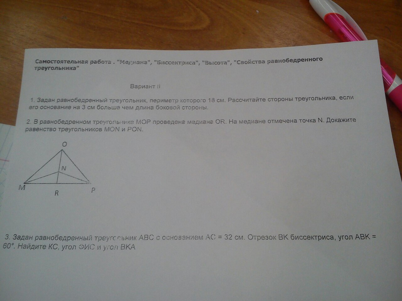Задание № 2.В равнобедренном треугольнике MOP проведена медиана OR. На медиане отмечена точка N. Докажите равенство треугольников MON и PON