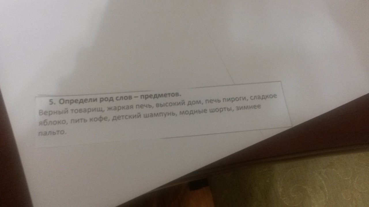товарищ - мужской род, печь - женский род, дом - мужской род, пироги - мужской род, яблоко - средний род, кофе - мужской род, шампунь - мужской род, шорты - средний род, пальто - средний род.