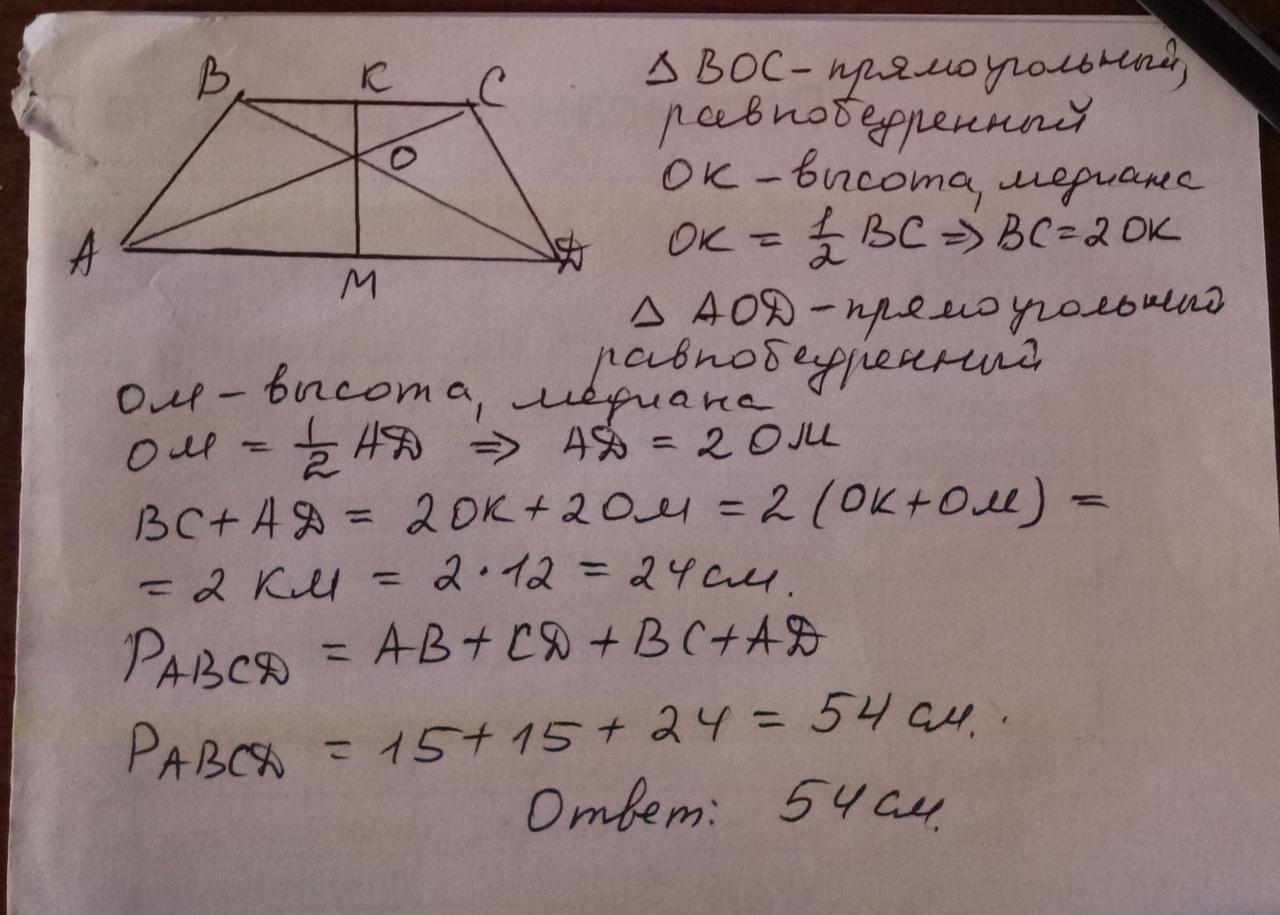 Высота равнобокой трапеции равна 12см, а ее диагонали перпендикулярны . Найдите периметр трапеции , если ее боковая сторона равна 15 см