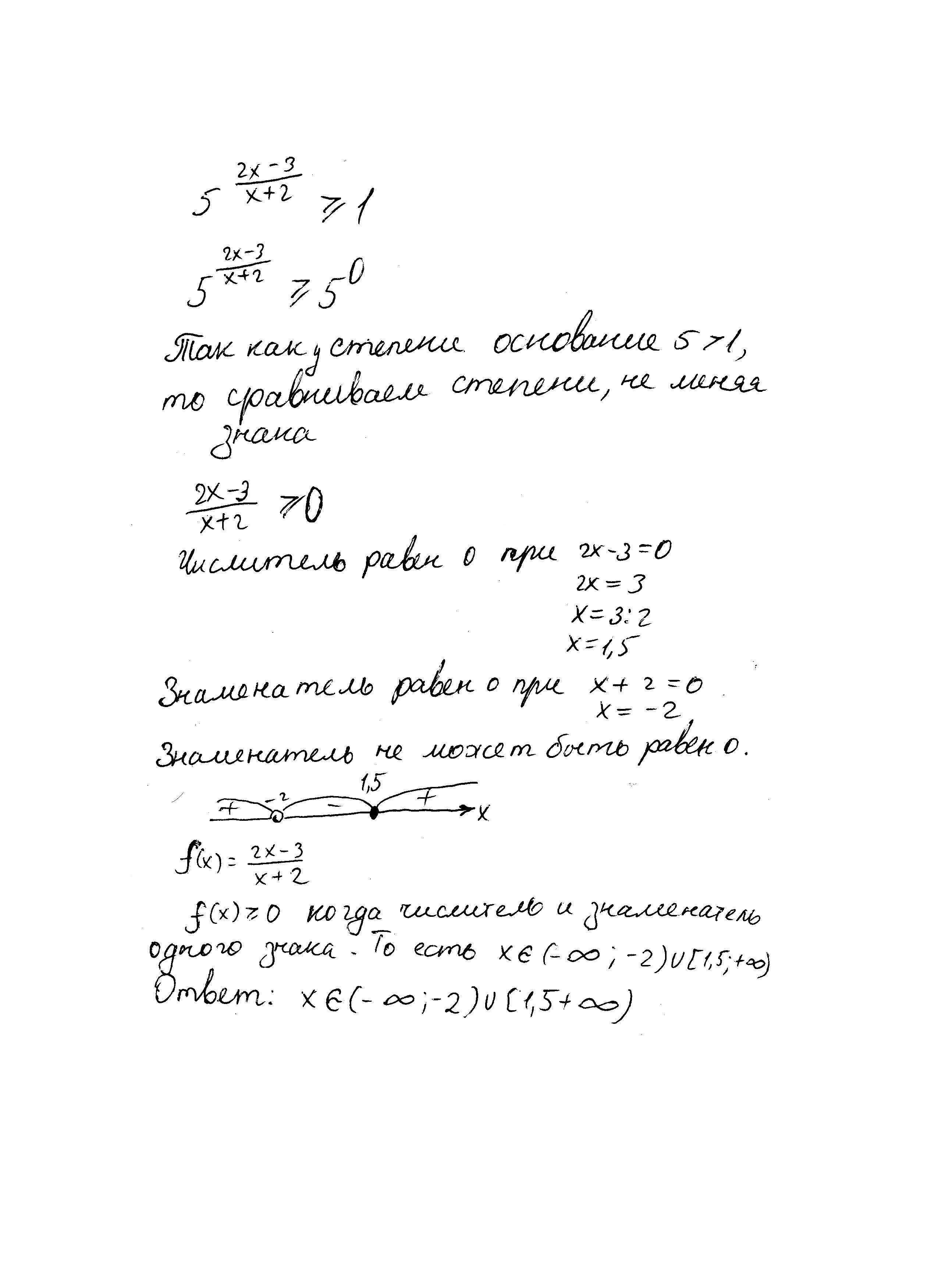 Решить неравенство 5^(2x-3/x+2)≥1