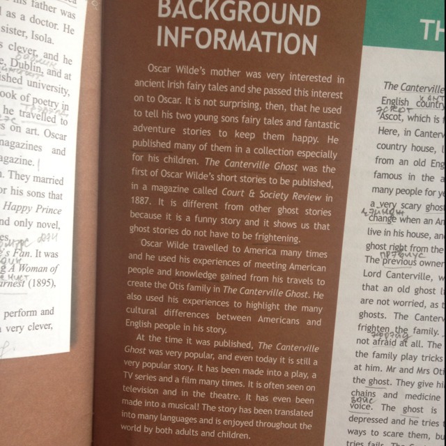 мать ИНФОРМАЦИЯ Оскара Уайльда был очень заинтересован в древних ирландское сказок, и она передала этот интерес по Оскару. Это не удивительно, то, что он имел обыкновение говорить двух своих маленьких сыновей сказки и фантастические истории приключений, чтобы держать их счастливыми. Он опубликовал многие из них в коллекции специально для своих детей. Кентервильское привидение был первым из коротких рассказов Оскара Уайльда, которые будут опубликованы в журнале под названием Court & Society Обзор в 1887. Он отличается от других историй о призраках, потому что это забавная история, и это показывает нам, что привидения не должны быть пугающей. Оскар Уайльд отправился в Америку много раз, и он использовал свой опыт встречи американского народа и знания, полученные от своих путешествий, чтобы создать семью Otis в Кентервильское привидение. Он также использовал свой опыт, чтобы выделить множество культурных различий между американцами и английским народом в его истории. В то время она была опубликована, Кентервильское очень т был очень популярен, и даже сегодня он по-прежнему ТВ популярная история. Это было сделано в игру, серии и фильм много раз. Он часто видел по телевизору, и я даже был сделан в Mus BAKPbITb аль
