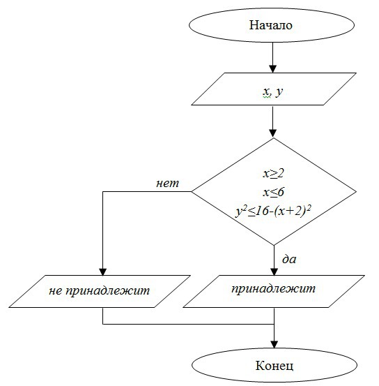 if (x>=2) and (x<=6) and (y*y<=16-sqr(x+2)) then