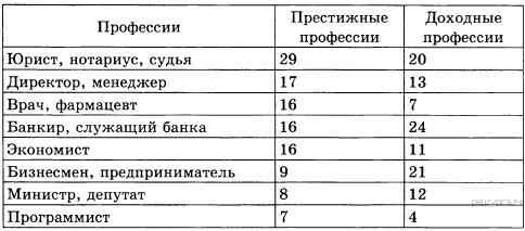 В 2 005 г. Всероссийский центр изучения общественного мнения провел социологический опрос среди жителей крупных городов России. Предлагалось назвать 2−3 наиболее престижные профессии и столько же наиболее доходных профессий. Полученные данные (в %) представлены в таблице.